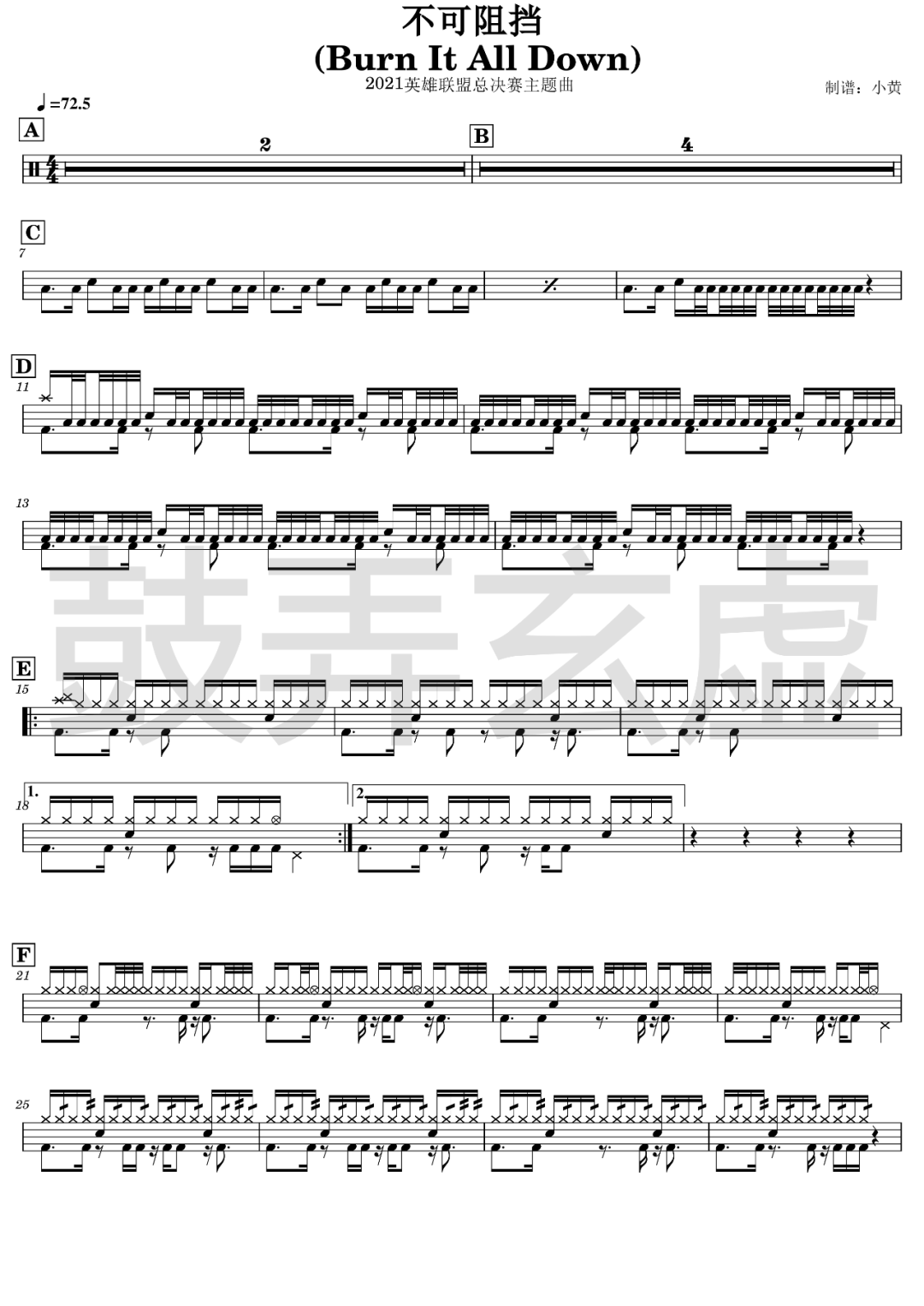 英雄联盟《不可阻挡(Burn It All Down)》架子鼓谱,鼓弄玄虚编配出品,共有2张高清图谱,由打鼓谱上传并分享。鼓谱:《不可阻挡(Burn It All Down)》 - 英雄联盟2021总决赛主题曲(首发)
