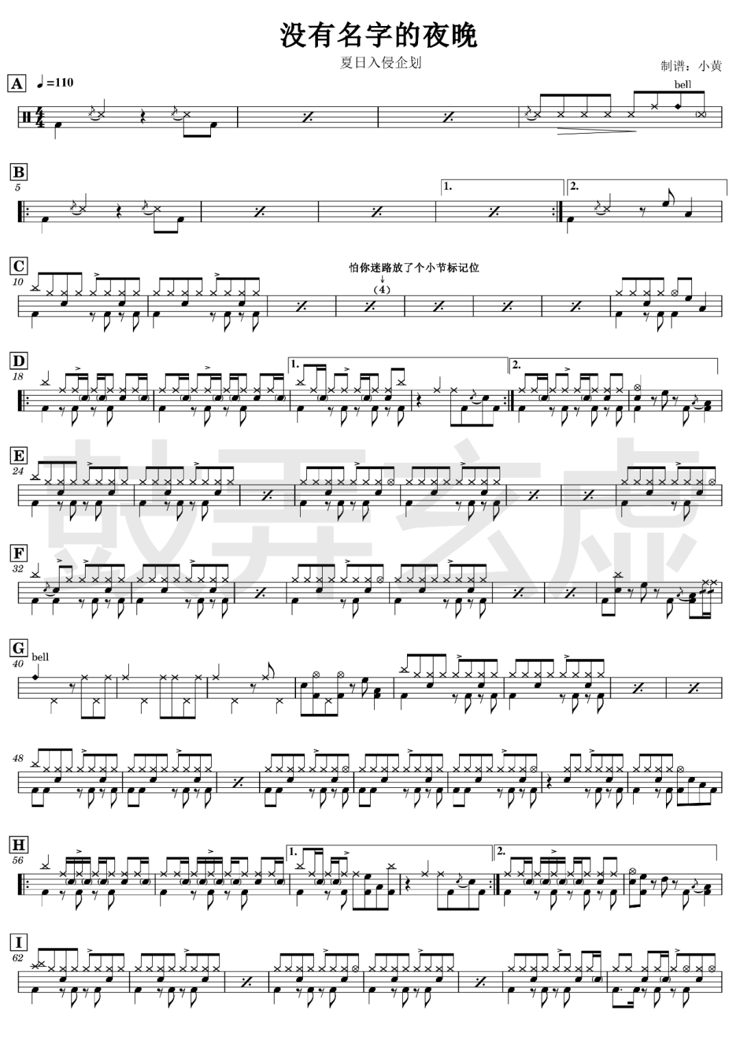 夏日入侵企划《没有名字的夜晚》架子鼓谱,鼓弄玄虚编配出品,共有2张高清图谱,由打鼓谱上传并分享。鼓谱:《没有名字的夜晚》-夏日入侵企划