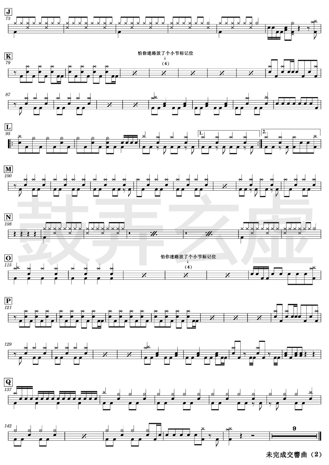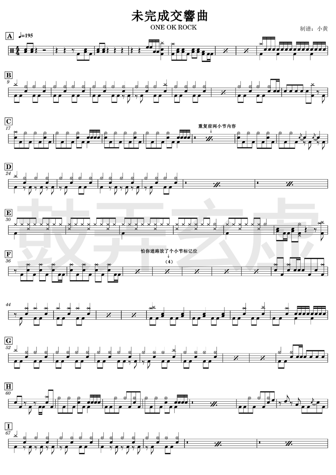 ONE OK ROCK《未完成交响曲》架子鼓谱,鼓弄玄虚编配出品,共有2张高清图谱,由打鼓谱上传并分享。鼓谱:《未完成交响曲》-ONE OK ROCK