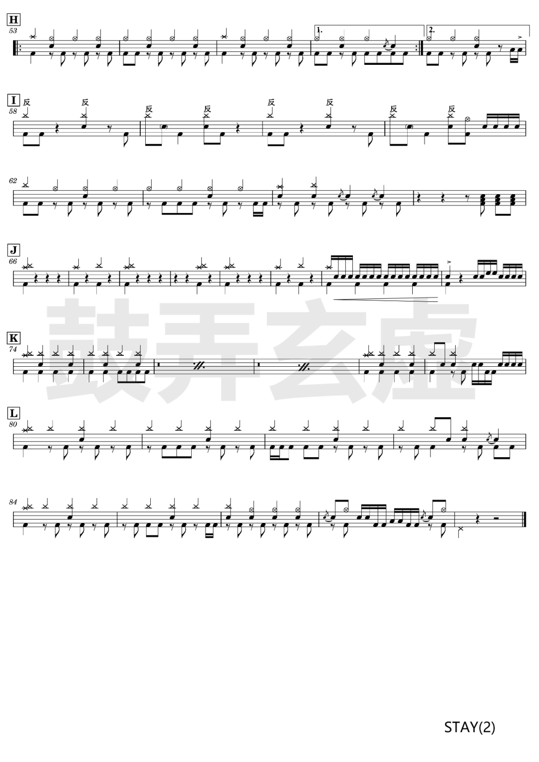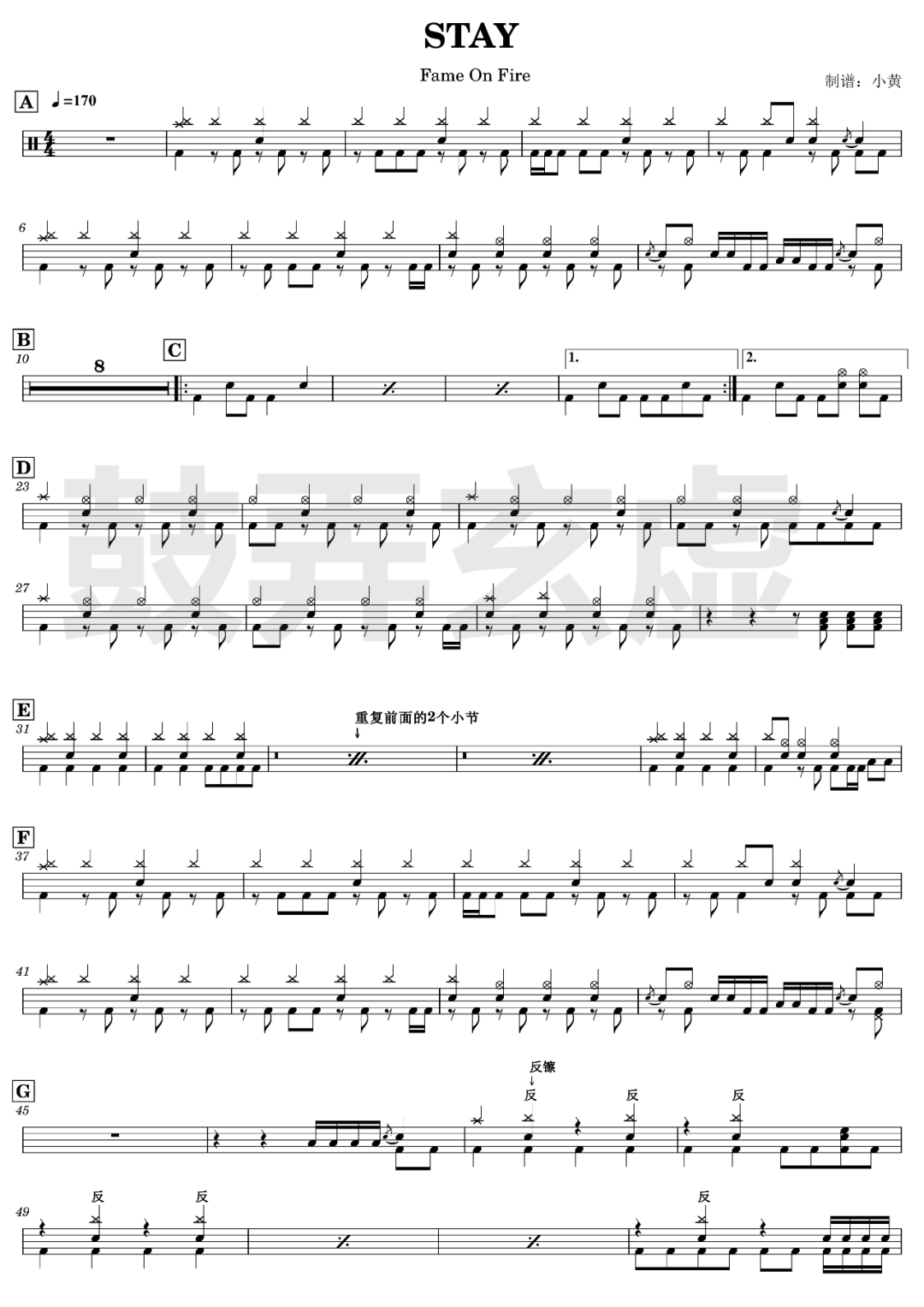 Fame On Fire《STAY》架子鼓谱,鼓弄玄虚编配出品,共有2张高清图谱,由打鼓谱上传并分享。鼓谱:《STAY》- Fame On Fire