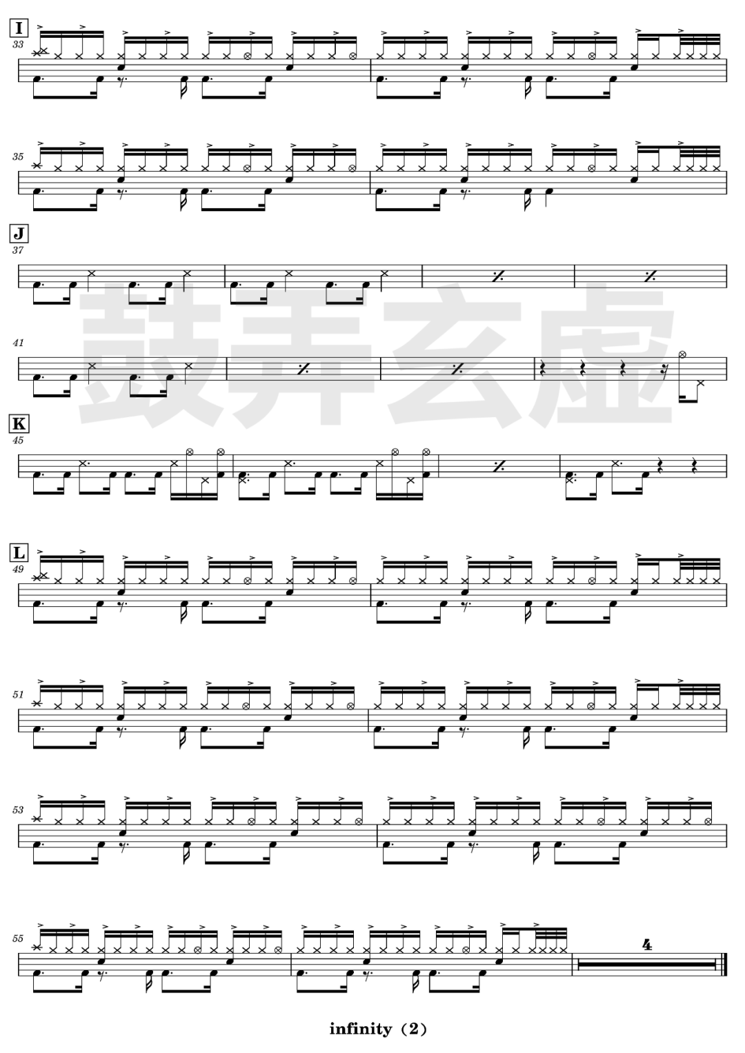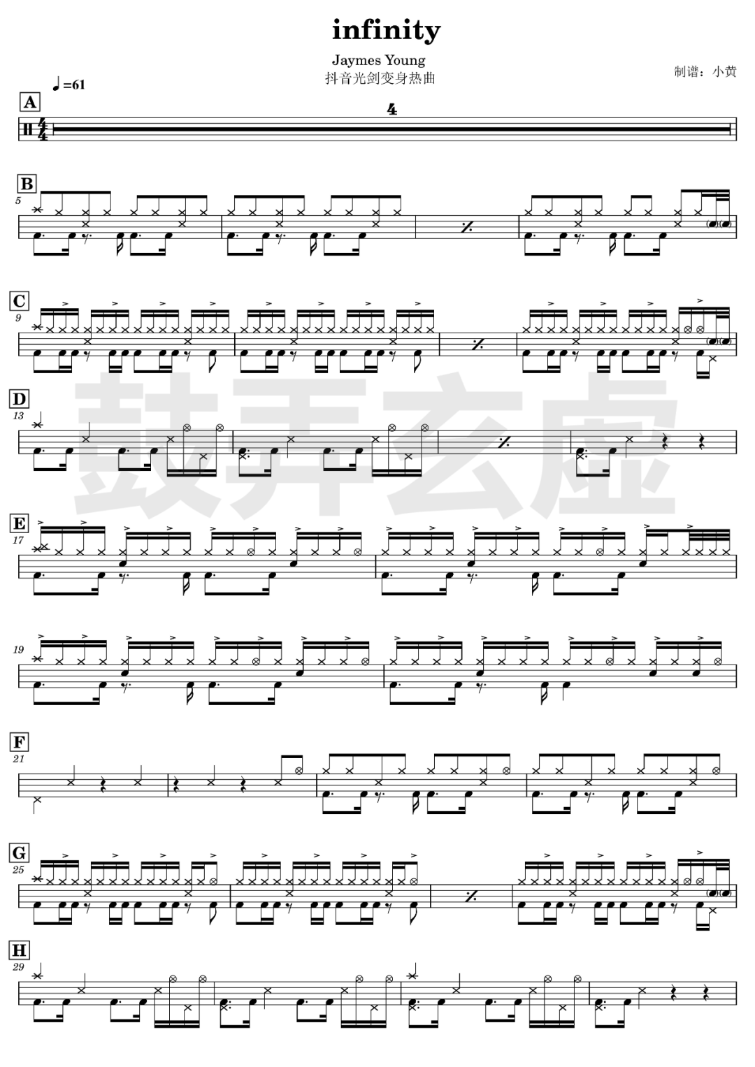 Jaymes Young《infinity》架子鼓谱抖音光剑变身热曲,鼓弄玄虚编配出品,共有2张高清图谱,由打鼓谱上传并分享。鼓谱:《infinity》-Jaymes Young 抖音光剑变身热曲