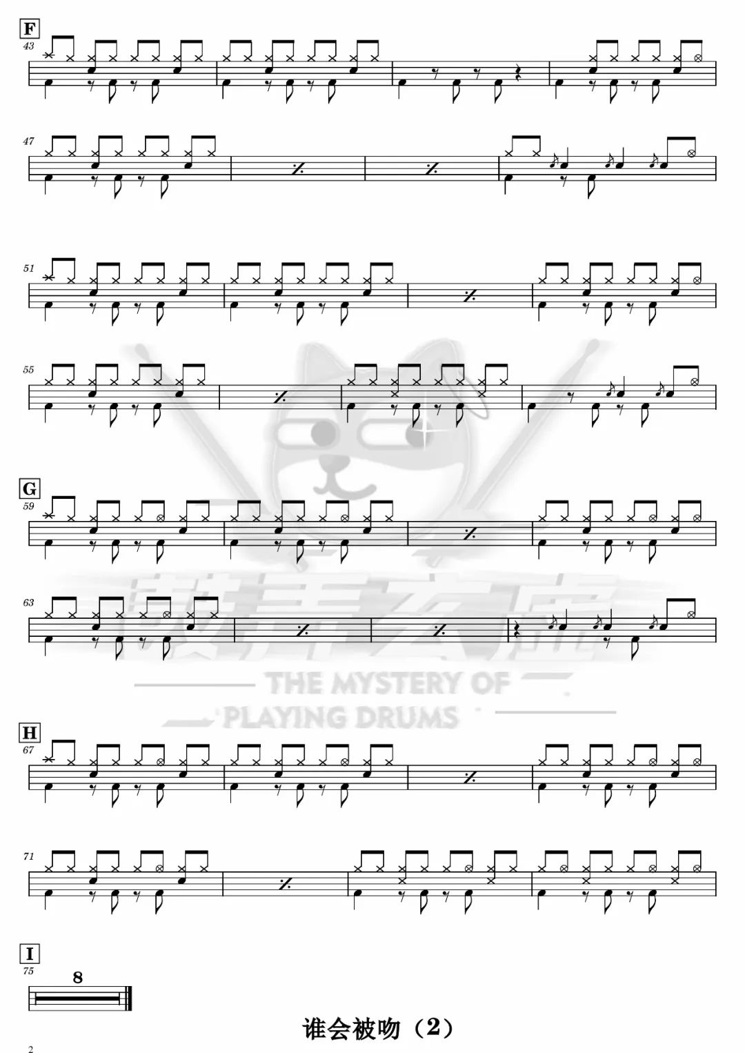 陆政廷Lil Jet《谁会被吻》架子鼓谱,鼓弄玄虚编配出品,共有2张高清图谱,由打鼓谱上传并分享。鼓谱:《谁会被吻》-陆政廷Lil Jet