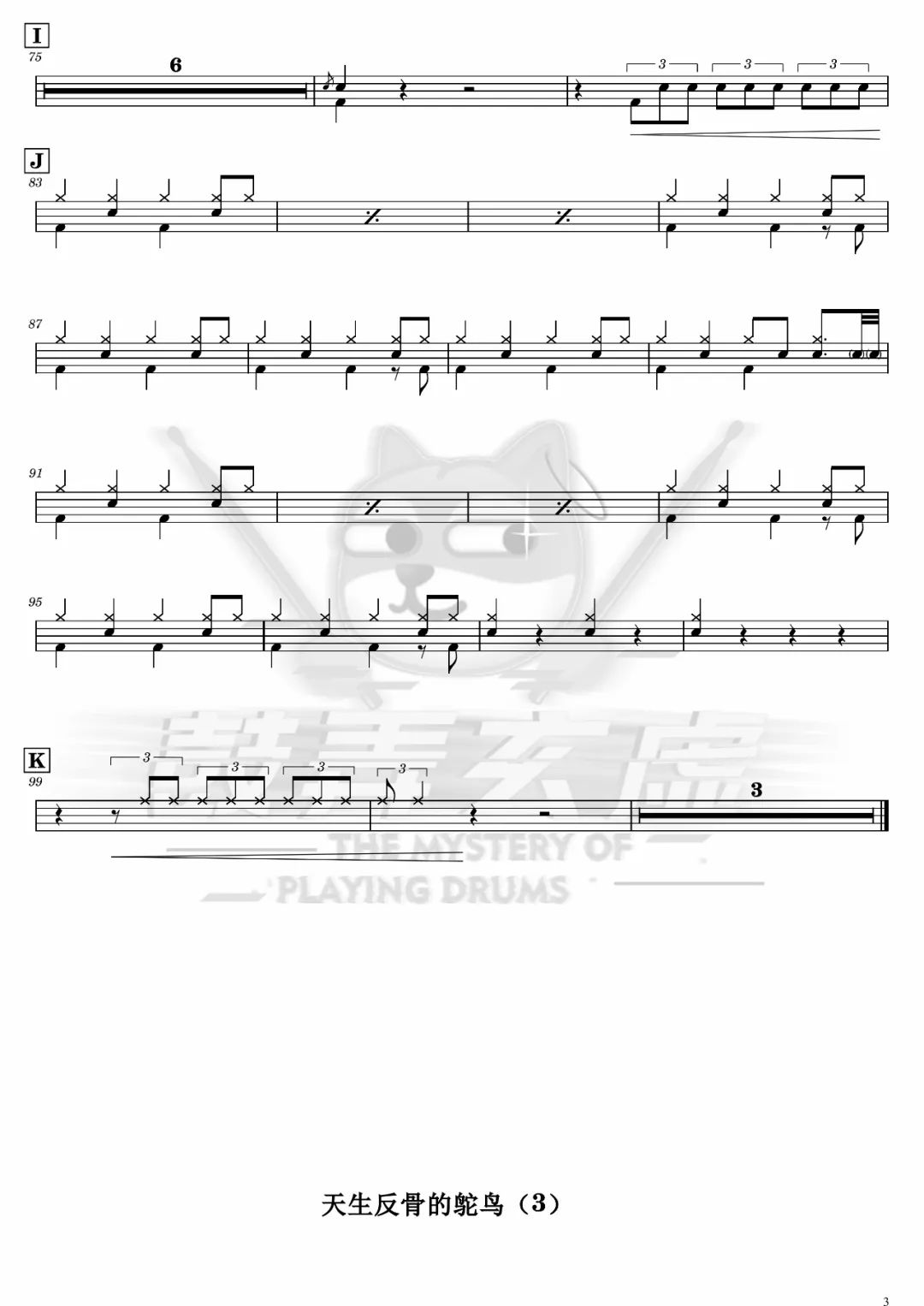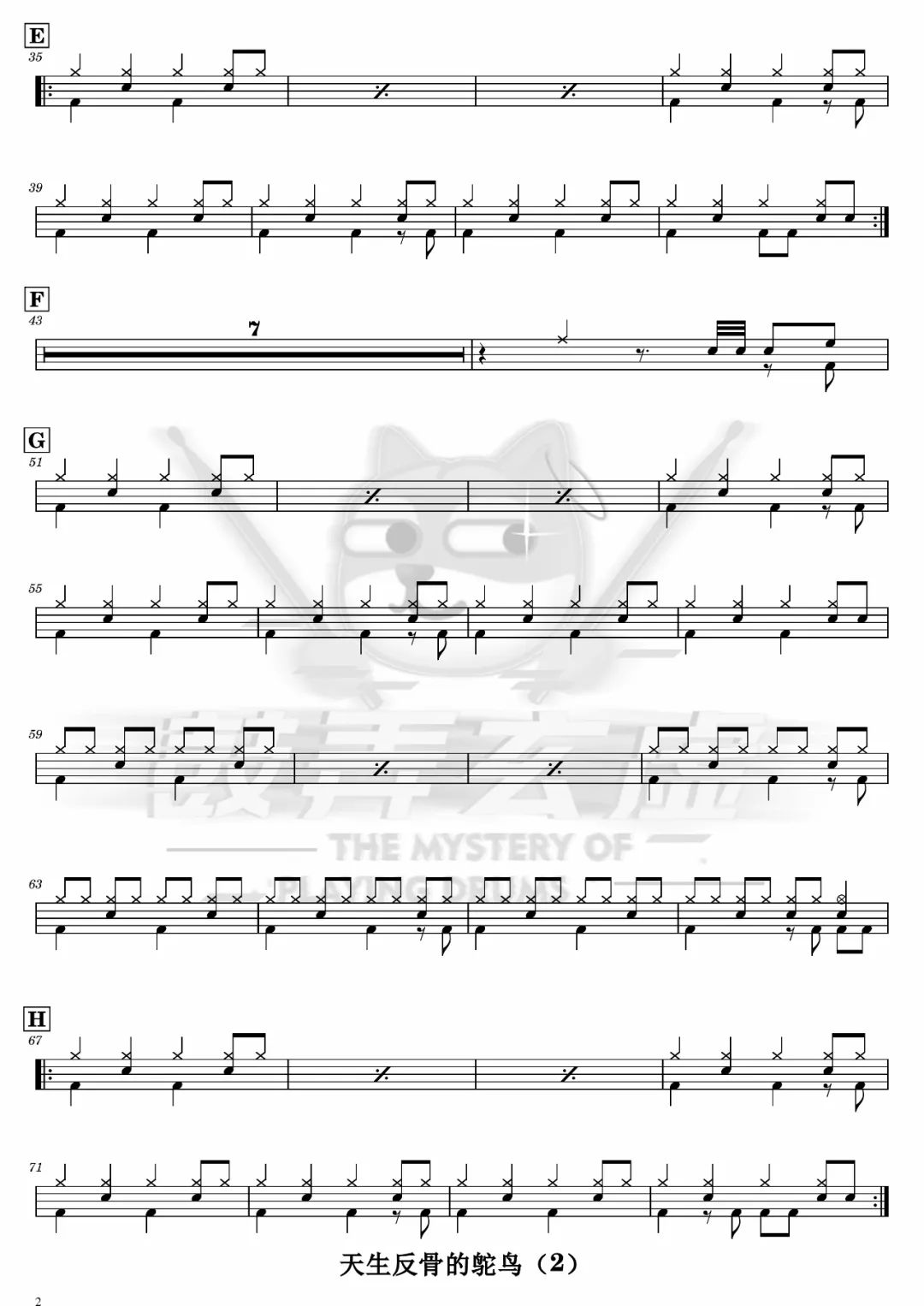 毛毛不插电《天生反骨的鸵鸟》架子鼓谱,鼓弄玄虚编配出品,共有3张高清图谱,由打鼓谱上传并分享。鼓谱:《天生反骨的鸵鸟》-毛毛不插电