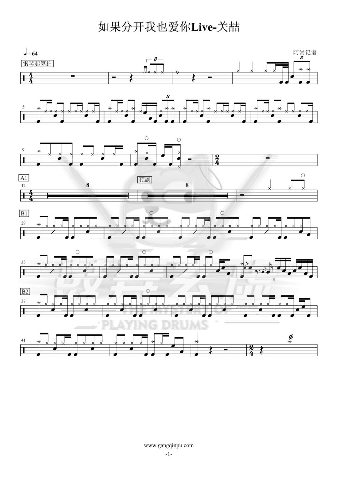 关喆《如果分开我也爱你》架子鼓谱,鼓弄玄虚编配出品,共有2张高清图谱,由打鼓谱上传并分享。鼓谱:《如果分开我也爱你Live》-关喆