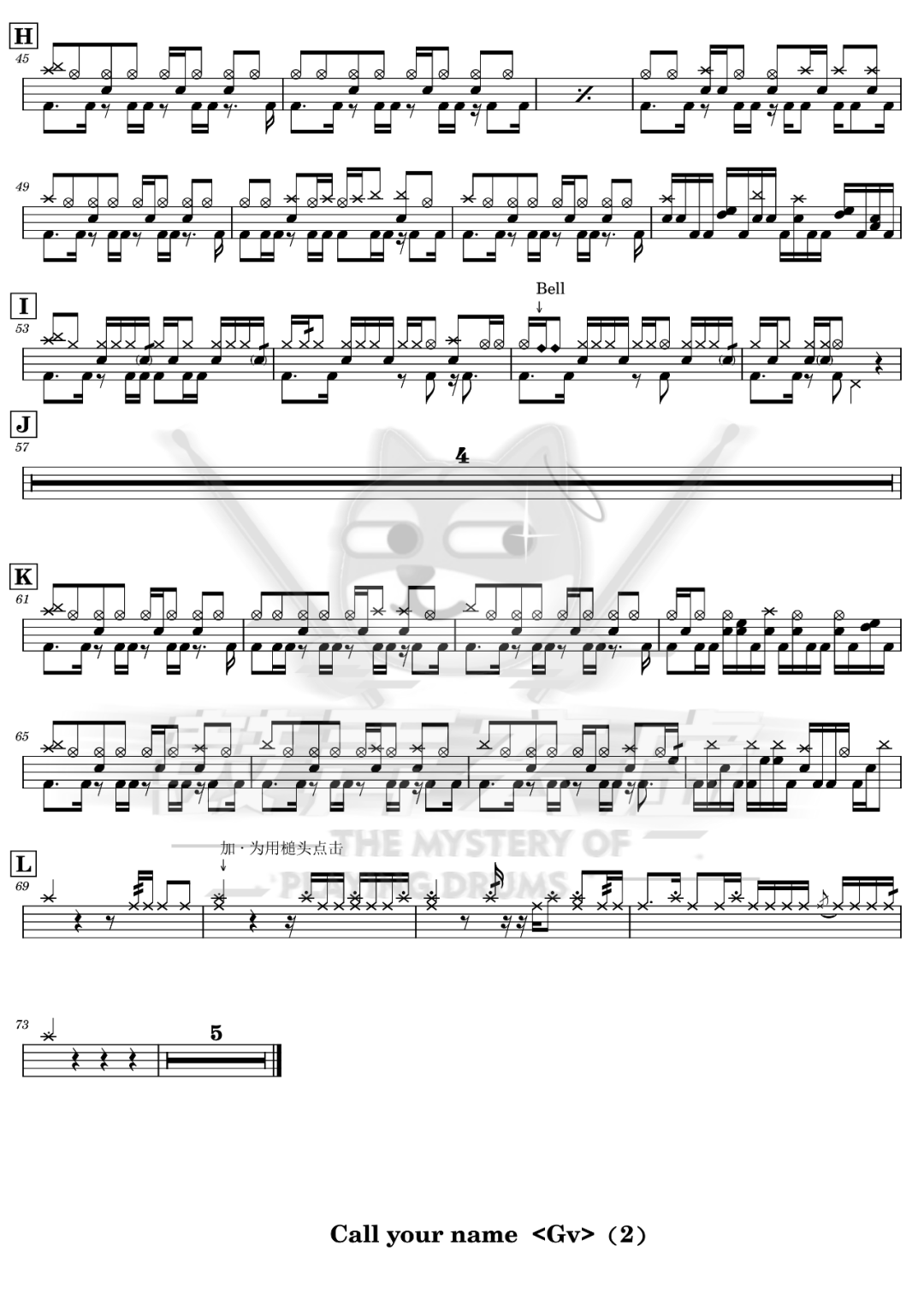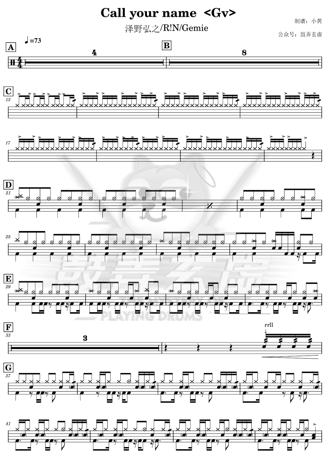 泽野弘之/R!N/Gemie《Call your name》架子鼓谱,鼓弄玄虚编配出品,共有2张高清图谱,由打鼓谱上传并分享。鼓谱:《Call your name 》-泽野弘之/R!N/Gemie