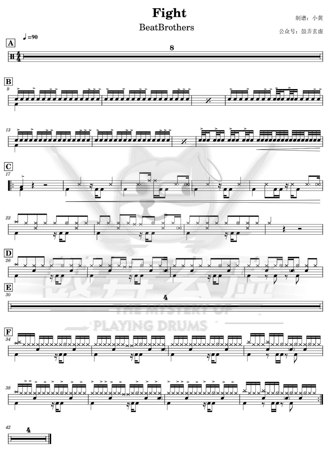 BeatBrothers《Fight》架子鼓谱,鼓弄玄虚编配出品,共有1张高清图谱,由打鼓谱上传并分享。鼓谱:《Fight》-BeatBrothers
