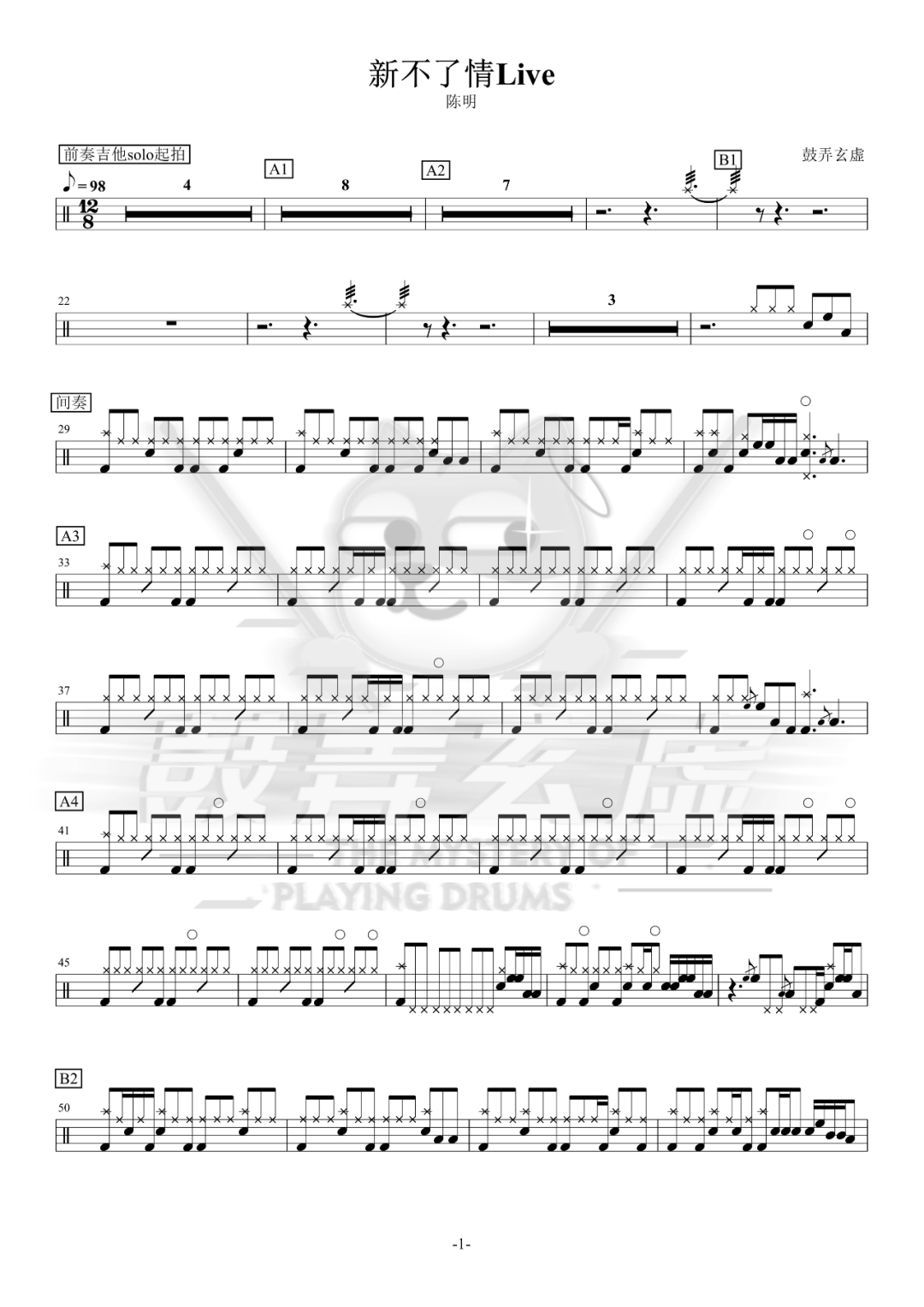 陈明《新不了情live》架子鼓谱我是歌手第一季第六期,鼓弄玄虚编配出品,共有2张高清图谱,由打鼓谱上传并分享。鼓谱:《新不了情live》-陈明 我是歌手第一季第六期