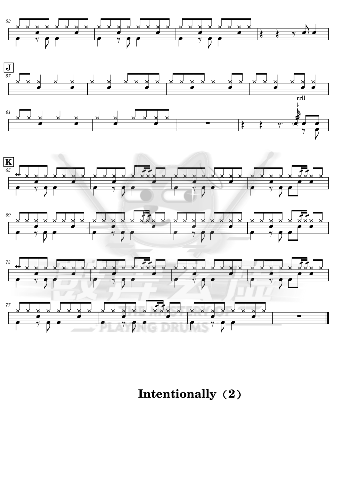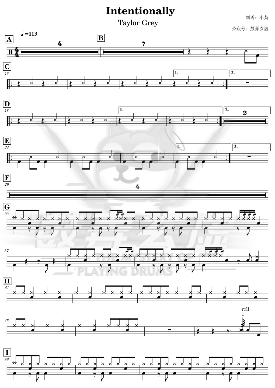 Taylor Grey《Intentionally》架子鼓谱,鼓弄玄虚编配出品,共有2张高清图谱,由打鼓谱上传并分享。鼓谱:《Intentionally》-Taylor Grey