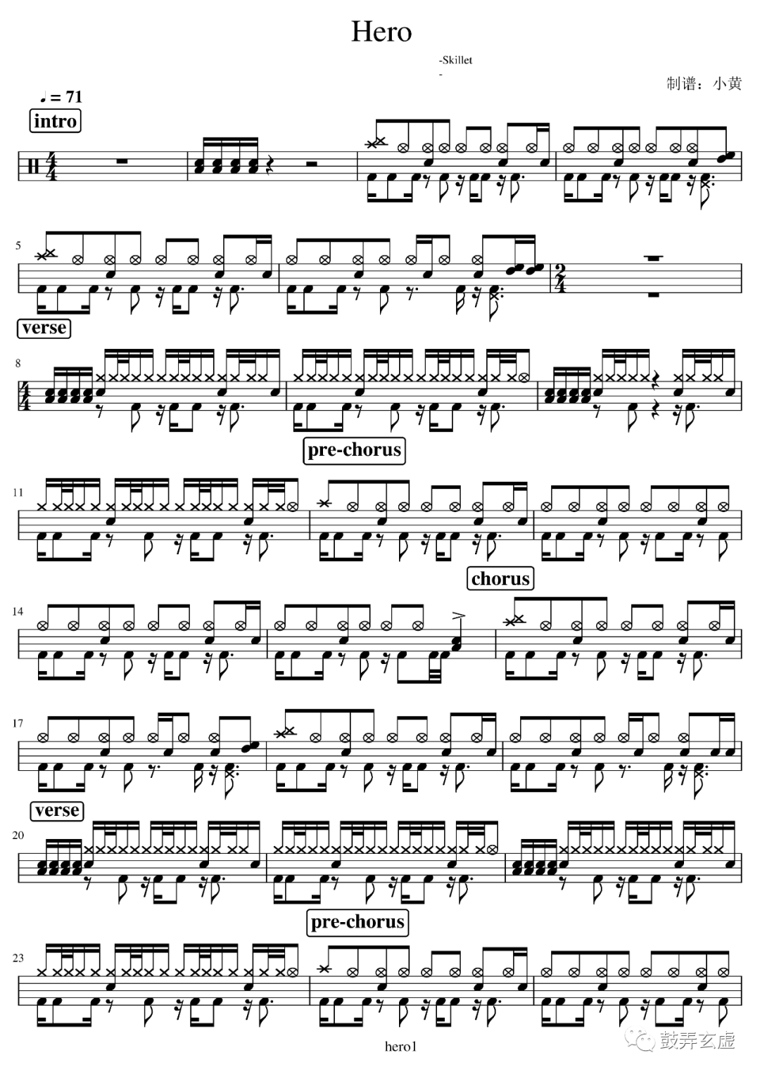 Skillet《Hero》架子鼓谱,鼓弄玄虚编配出品,共有2张高清图谱,由打鼓谱上传并分享。Skillet《Hero》鼓谱_架子鼓谱