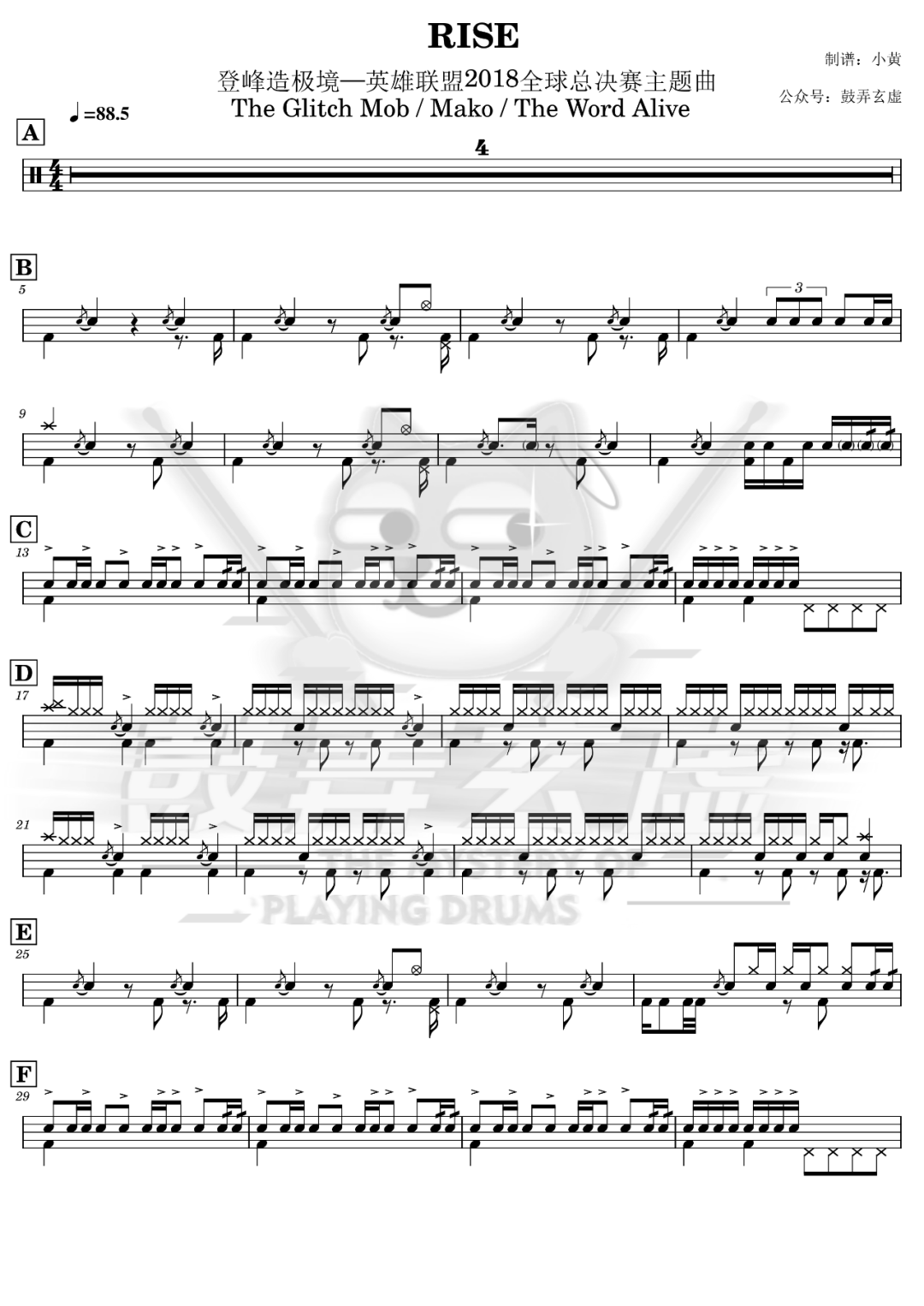 英雄联盟2018全球总决赛主题曲《Rise》鼓谱 - 架子鼓谱