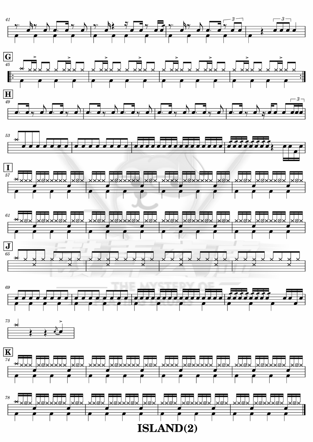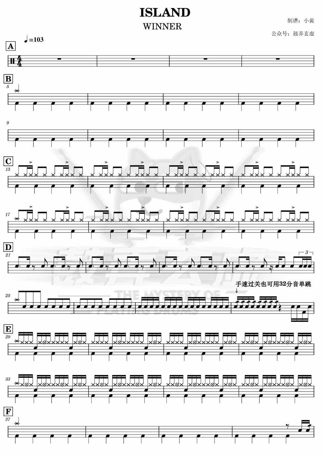 WINNER《ISLAND》架子鼓谱,鼓弄玄虚编配出品,共有2张高清图谱,由打鼓谱上传并分享。鼓谱:《ISLAND》-WINNER