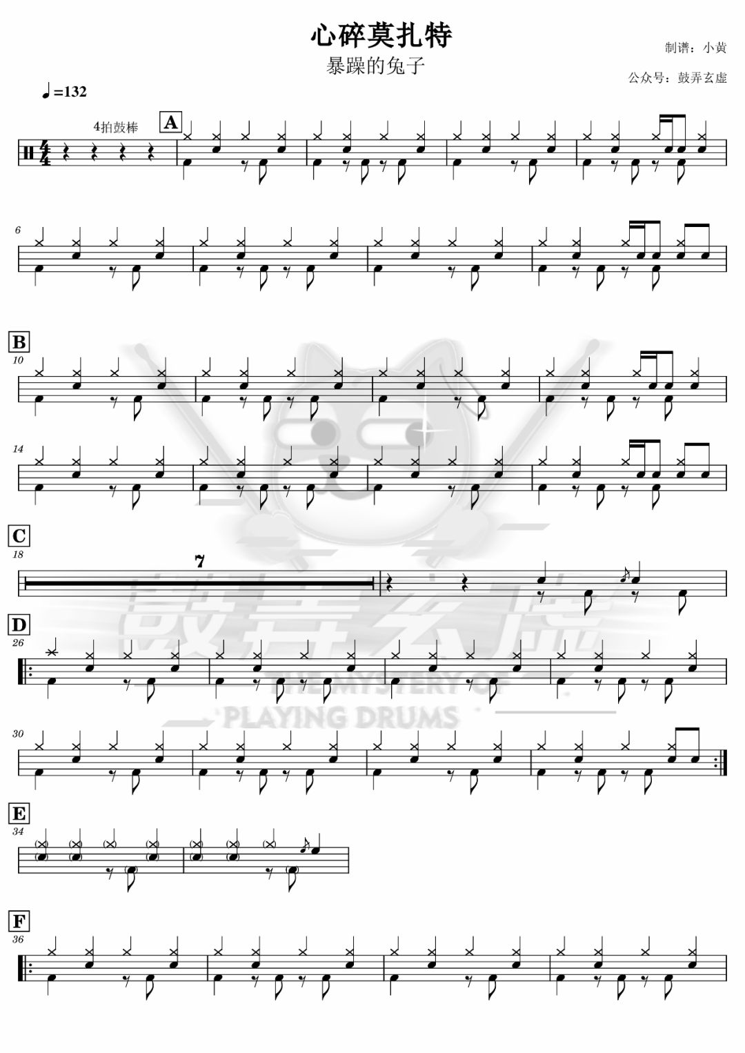 暴躁的兔子《心碎莫扎特》架子鼓谱,鼓弄玄虚编配出品,共有2张高清图谱,由打鼓谱上传并分享。鼓谱:《心碎莫扎特》-暴躁的兔子