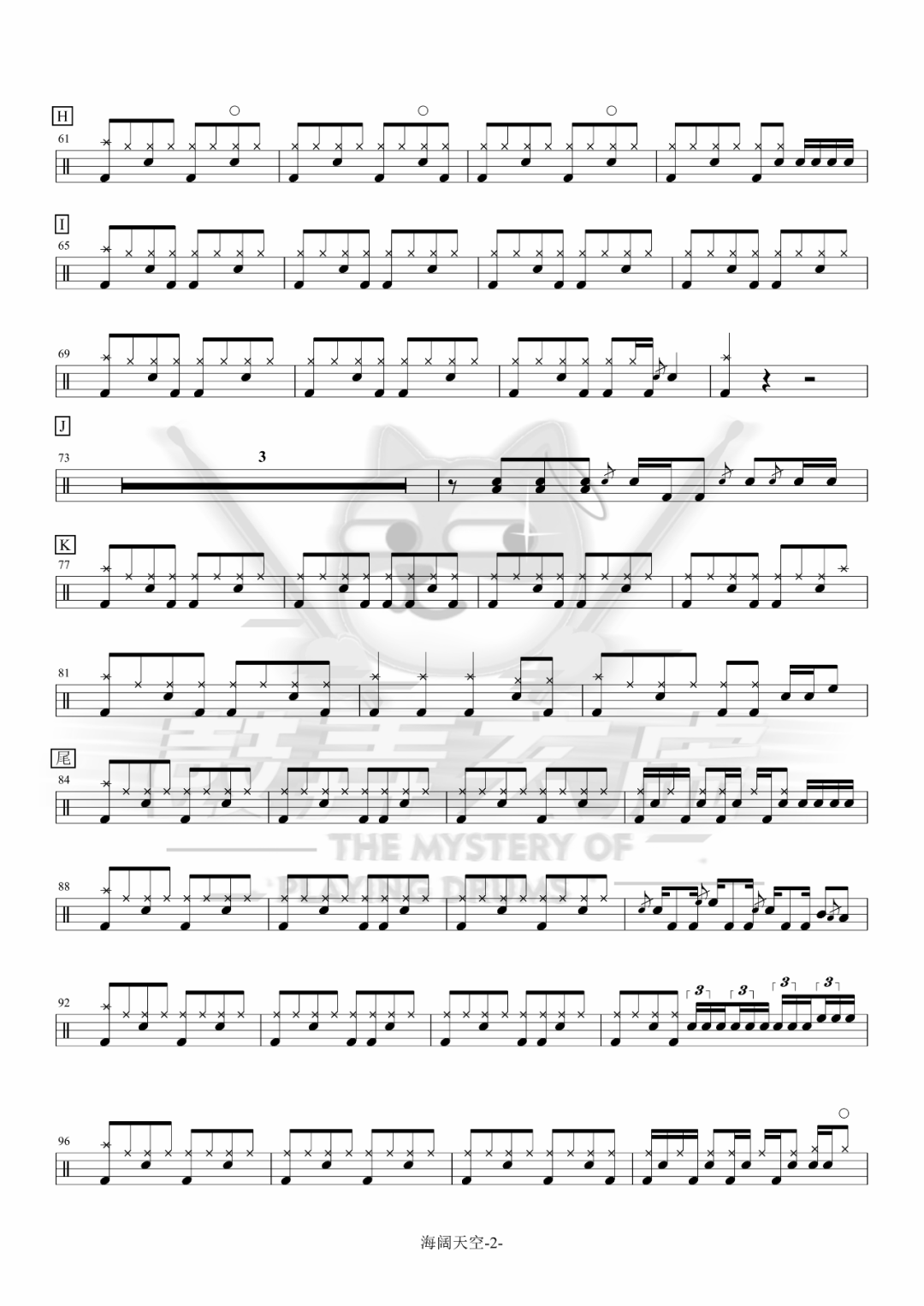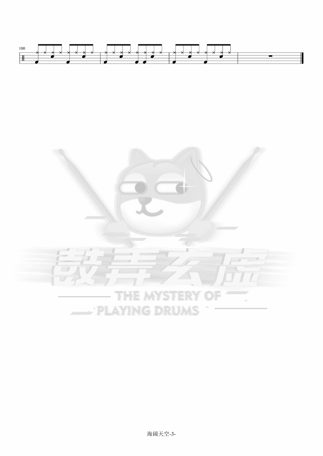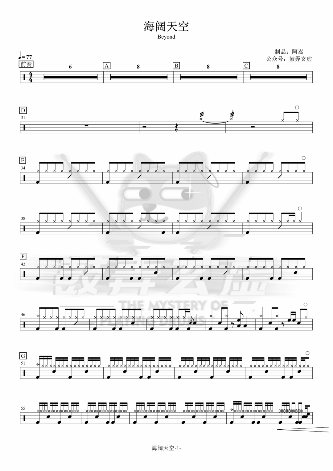 Beyond《海阔天空》架子鼓谱,鼓弄玄虚编配出品,共有3张高清图谱,由打鼓谱上传并分享。鼓谱:《海阔天空》-Beyond