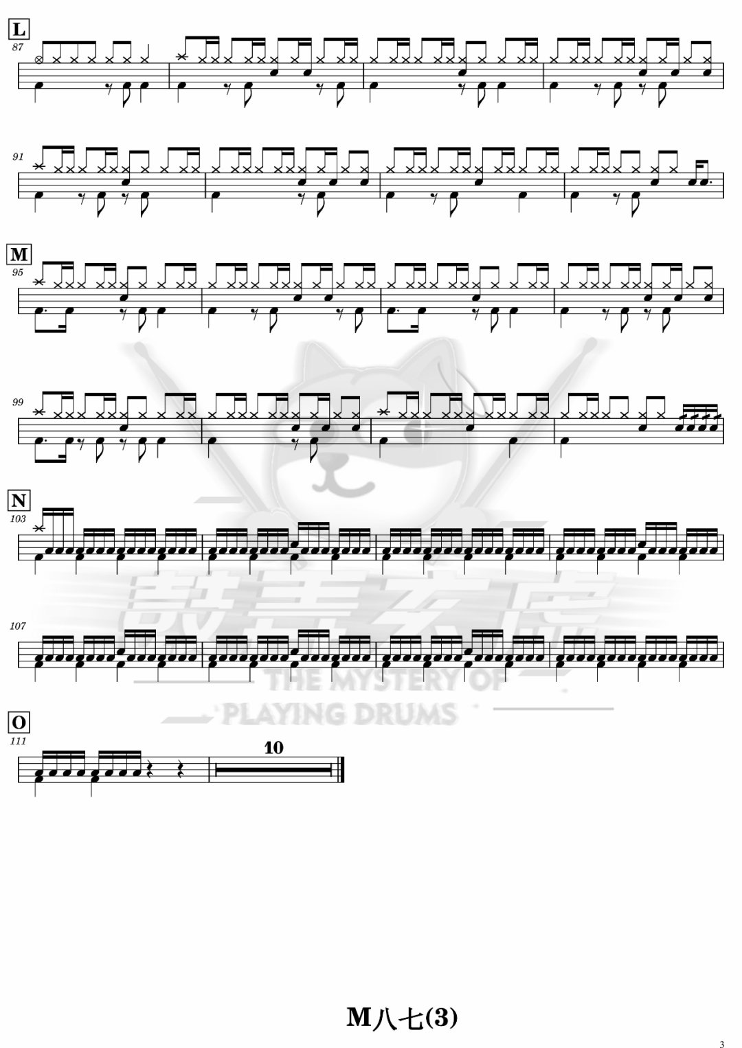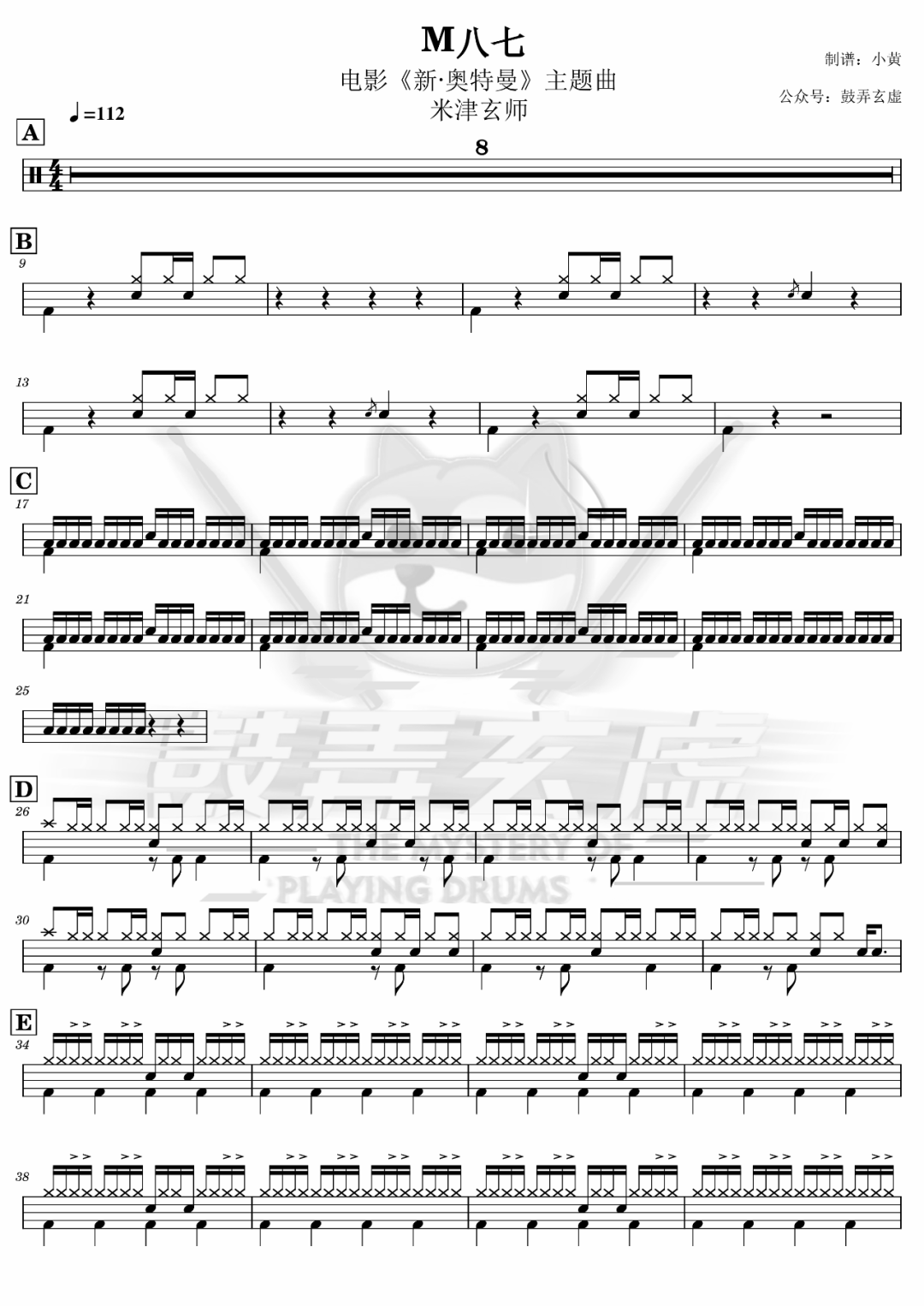 米津玄师《M八七》架子鼓谱,鼓弄玄虚编配出品,共有3张高清图谱,由打鼓谱上传并分享。鼓谱:《M八七》-米津玄师(电影《新·奥特曼》主题曲)