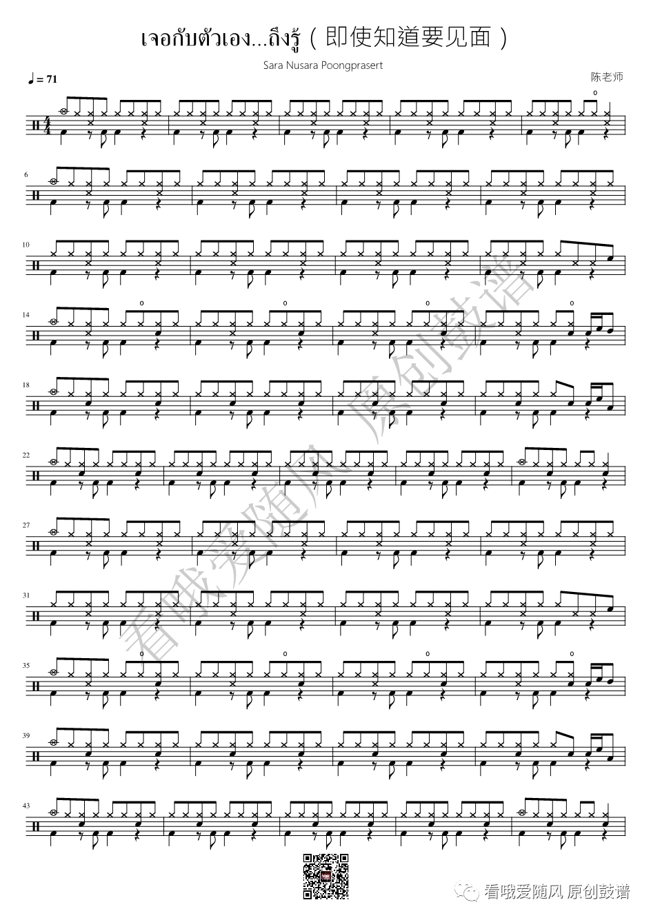 记忆深处的泰语歌《即使知道要见面》架子鼓谱, 看哦爱随风编配出品,共有2张高清图谱,由打鼓谱上传并分享。NO.846 เจอกับตัวเอง...ถึงรู้(即使知道要见面)【记忆深处的泰语歌】鼓谱