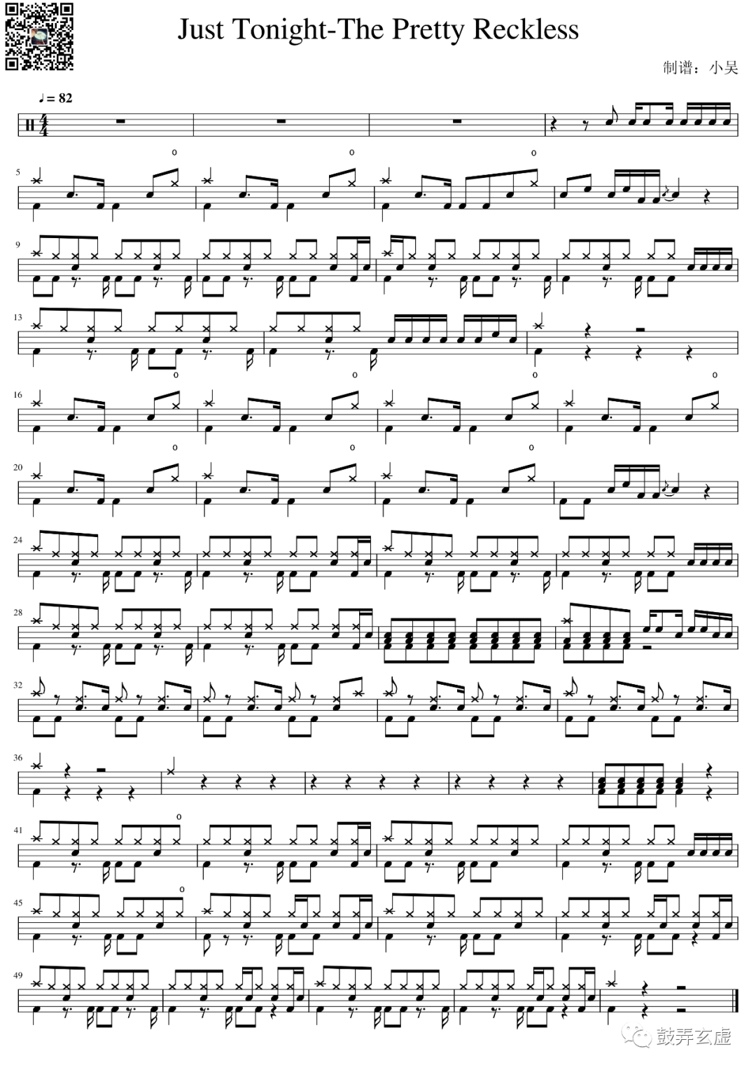 The pretty Reckless《Just Tonight》架子鼓谱,鼓弄玄虚编配出品,共有1张高清图谱,由打鼓谱上传并分享。鼓谱:《Just Tonight》-The pretty Reckless