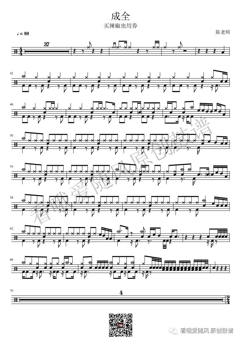 买辣椒也用券《成全》架子鼓谱, 看哦爱随风编配出品,共有2张高清图谱,由打鼓谱上传并分享。NO.165 成全 买辣椒也用券 鼓谱