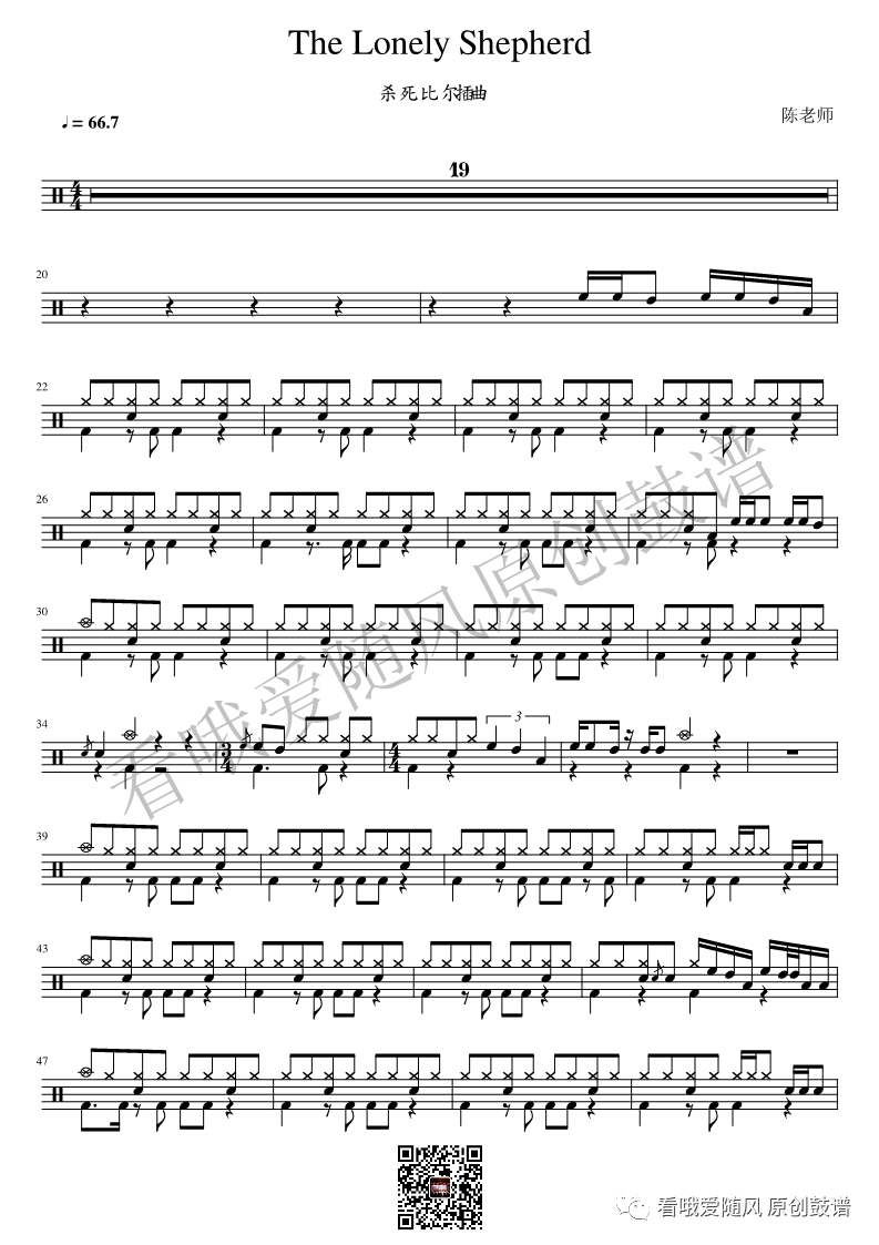杀死比尔《孤独的牧羊人》架子鼓谱, 看哦爱随风编配出品,共有2张高清图谱,由打鼓谱上传并分享。NO.32 孤独的牧羊人【杀死比尔】