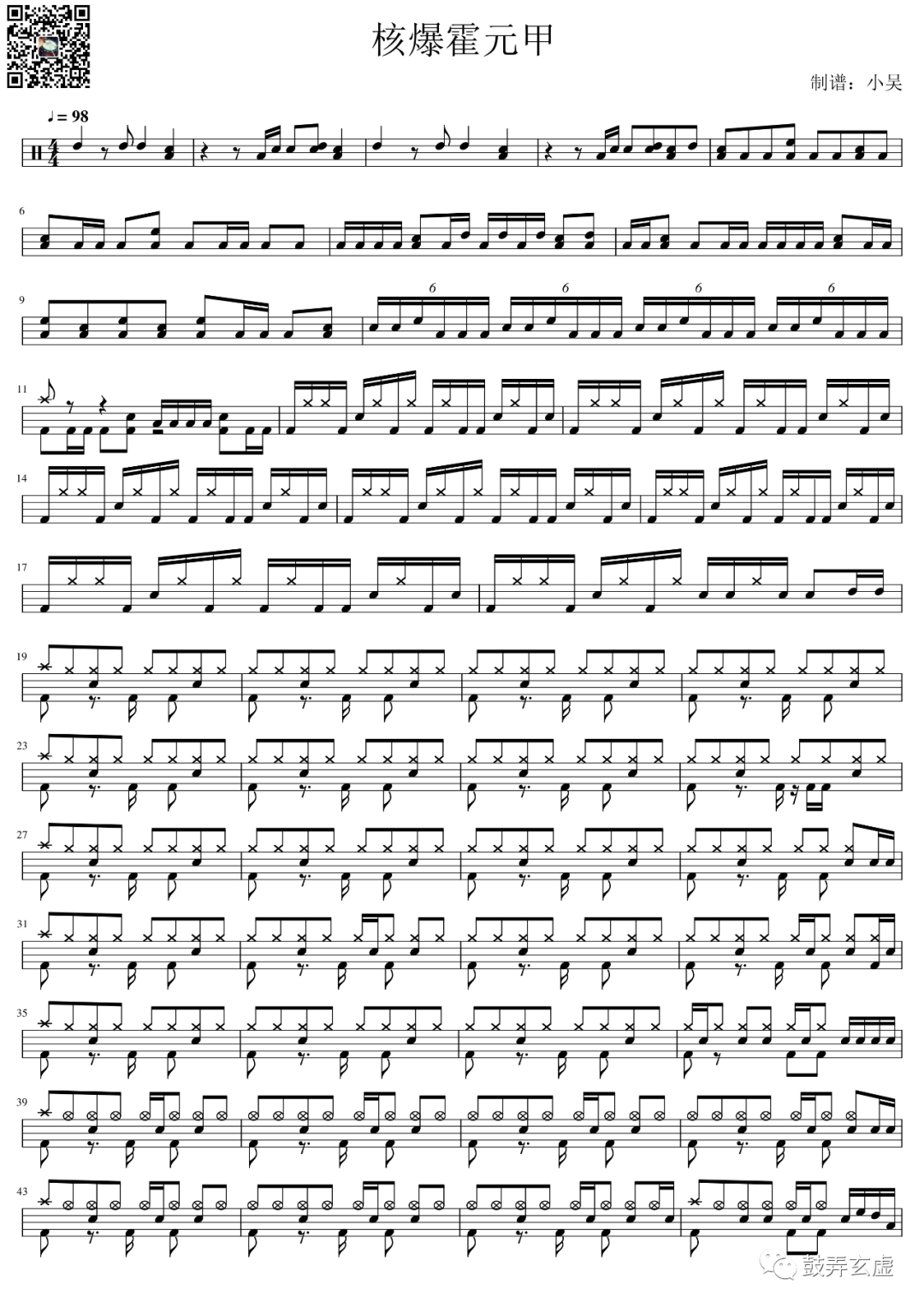 周杰伦《核爆霍元甲》架子鼓谱,鼓弄玄虚编配出品,共有3张高清图谱,由打鼓谱上传并分享。鼓谱:《核爆霍元甲》-原周杰伦,泽野弘之