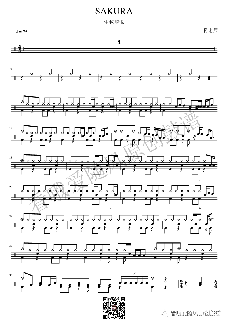 生物股长《SAKURA》架子鼓谱, 看哦爱随风编配出品,共有3张高清图谱,由打鼓谱上传并分享。NO.27 SAKURA 生物股长
