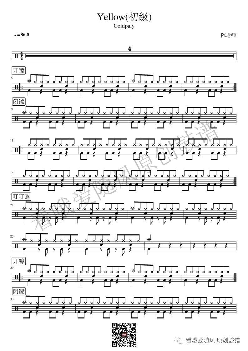 Coldplay《Yellow》架子鼓谱初级版, 看哦爱随风编配出品,共有2张高清图谱,由打鼓谱上传并分享。NO.37 Yellow(初级) Coldplay