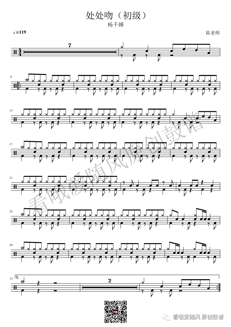 杨千嬅《处处吻》架子鼓谱初级版, 看哦爱随风编配出品,共有2张高清图谱,由打鼓谱上传并分享。NO.47 处处吻(初级)杨千嬅