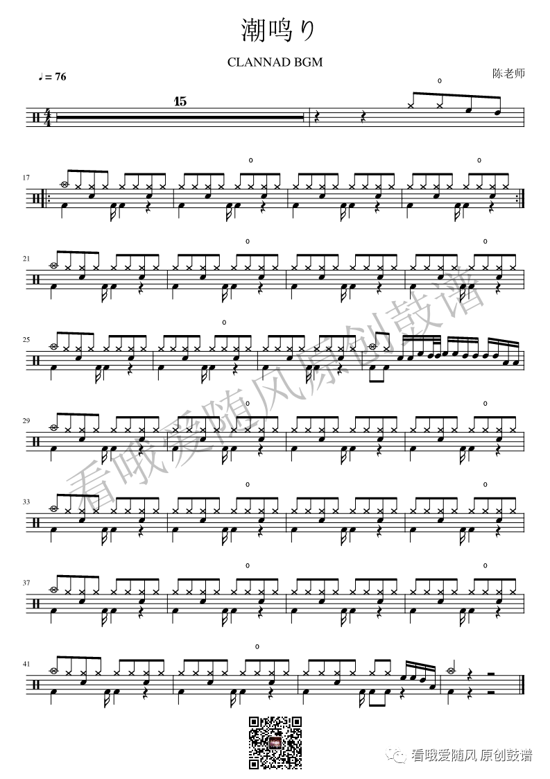Clannad《潮鸣り》架子鼓谱, 看哦爱随风编配出品,共有1张高清图谱,由打鼓谱上传并分享。NO.45 潮鸣り【Clannad】