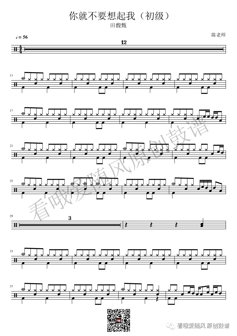 田馥甄《你就不要想起我》架子鼓谱初级版, 看哦爱随风编配出品,共有2张高清图谱,由打鼓谱上传并分享。NO.85 你就不要想起我(初级)田馥甄 鼓谱