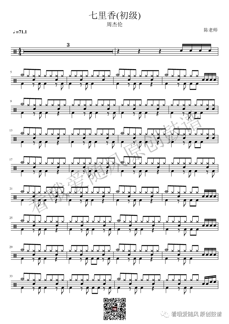 周杰伦《七里香》架子鼓谱初级版, 看哦爱随风编配出品,共有2张高清图谱,由打鼓谱上传并分享。NO.92 七里香(初级)周杰伦 鼓谱
