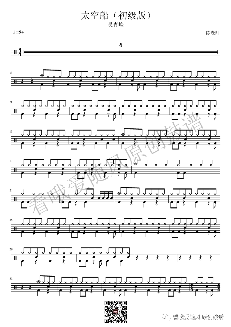 吴青峰《太空船》架子鼓谱初级版, 看哦爱随风编配出品,共有2张高清图谱,由打鼓谱上传并分享。NO.106 太空船(初级)吴青峰