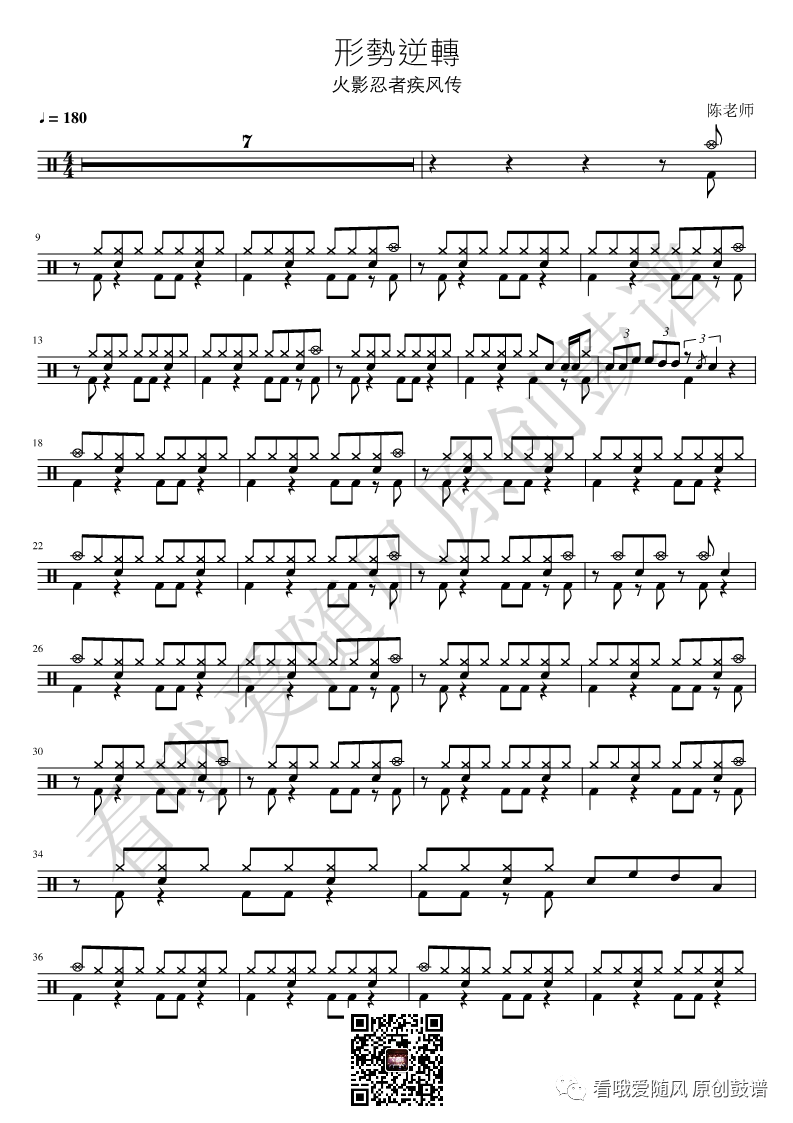 火影忍者《形势逆转》架子鼓谱, 看哦爱随风编配出品,共有3张高清图谱,由打鼓谱上传并分享。NO.184 形势逆转【火影忍者】鼓谱