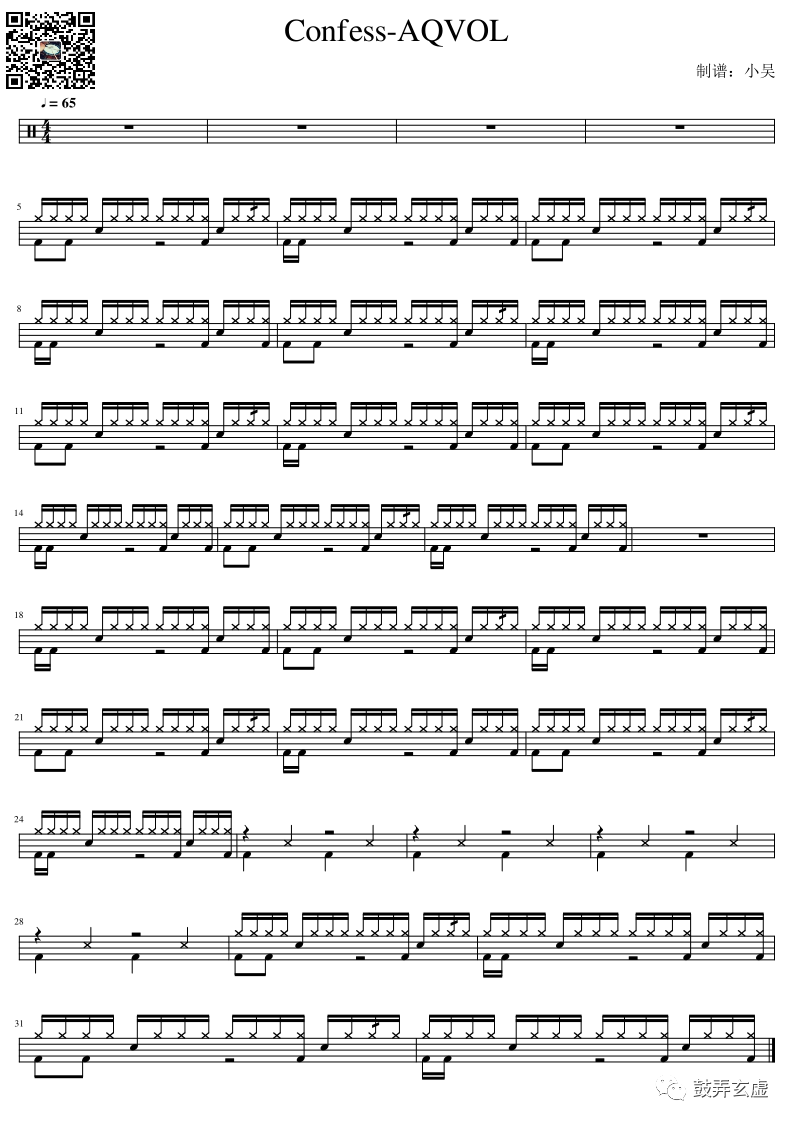 AQVOL《Confess》架子鼓谱,鼓弄玄虚编配出品,共有1张高清图谱,由打鼓谱上传并分享。鼓谱:《Confess》-AQVOL