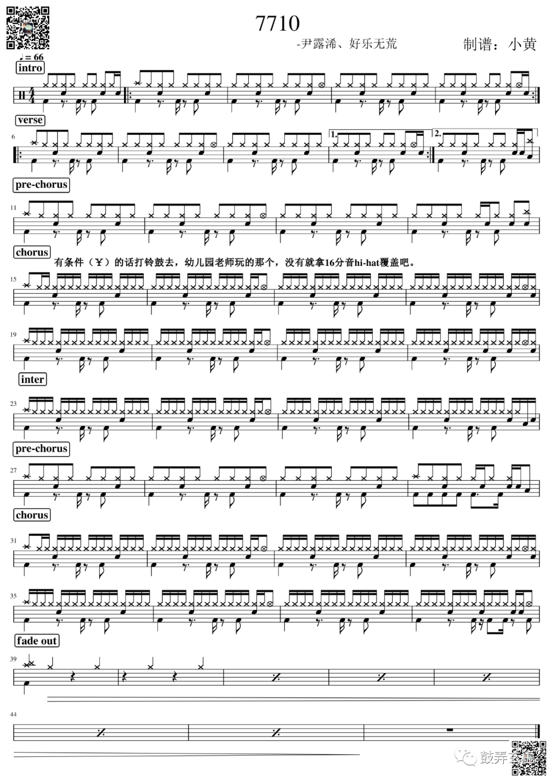 尹露浠/好乐无荒《7710》架子鼓谱,鼓弄玄虚编配出品,共有1张高清图谱,由打鼓谱上传并分享。鼓谱:《7710》-尹露浠/好乐无荒