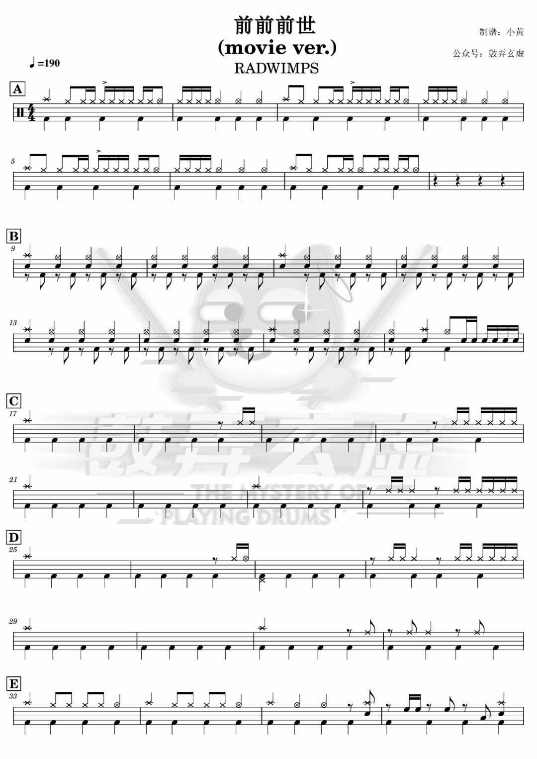 你的名字《前前前世》鼓谱 - 架子鼓谱 鼓弄玄虚 • 2022-11-03 • 阅读 1463 你的名字《前前前世》架子鼓谱,鼓弄玄虚编配出品,共有6张高清图谱,由打鼓谱上传并分享。鼓谱:《前前前世》(movie ver.)-RADWIMPS(《你的名字》主题曲) 你的名字《前前前世》鼓谱 - 架子鼓谱 - 第1张 你的名字《前前前世》鼓谱 - 架子鼓谱 - 第2张 你的名字《前前前世》鼓谱 - 架子鼓谱 - 第3张 你的名字《前前前世》鼓谱 - 架子鼓谱 - 第4张 你的名字《前前前世》鼓谱 - 架子鼓谱 - 第5张 你的名字《前前前世》鼓谱 - 架子鼓谱 - 第6张 免责声明:本文版权归属鼓弄玄虚,本站不对其内容的准确性给予任何承诺,收录仅供读者参考。如本文侵犯了您的合法权益,请及时联系本站,我们将在24小时内删除处理。本文链接:https://www.dagupu.com/pu/482.html Beyond《真的爱你》鼓谱 - 架子鼓谱 上一篇 2022-11-03 ONE OK ROCK《Fight The Night》鼓谱 - 架子鼓谱 下一篇 2022-11-03 相关推荐 ONE OK ROCK《Re:make》鼓谱 - 架子鼓谱 ONEOKROCK《Re:make》架子鼓谱,看哦爱随风编配出品,共有3张高清图谱,由打鼓谱上传并分享。 看哦爱随风 2023-06-17 5465 ONE OK ROCK《完全感觉Dreamer》鼓谱 - 架子鼓谱 ONEOKROCK《完全感觉Dreamer》架子鼓谱,看哦爱随风编配出品,共有4张高清图谱,由打鼓谱上传并分享。 看哦爱随风 2023-06-17 4043 ONE OK ROCK《The Beginning》鼓谱 - 架子鼓谱 ONEOKROCK《TheBeginning》架子鼓谱,看哦爱随风编配出品,共有3张高清图谱,由打鼓谱上传并分享。 看哦爱随风 2023-06-17 3606 ONE OK ROCK《未完成交響曲》鼓谱 - 架子鼓谱 ONEOKROCK《未完成交響曲》架子鼓谱,看哦爱随风编配出品,共有1张高清图谱,由打鼓谱上传并分享。 看哦爱随风 2023-06-17 3253 网球王子《future》鼓谱 - 架子鼓谱 网球王子《future》架子鼓谱,看哦爱随风编配出品,共有1张高清图谱,由打鼓谱上传并分享。 看哦爱随风 2023-06-17 3785 夏日入侵企画《人间萤火》鼓谱 - 架子鼓谱 夏日入侵企画《人间萤火》架子鼓谱,看哦爱随风编配出品,共有2张高清图谱,由打鼓谱上传并分享。 看哦爱随风 2023-02-26 3598 夏日入侵企画《勇气》鼓谱 - 架子鼓谱 夏日入侵企画《勇气》架子鼓谱,看哦爱随风编配出品,共有2张高清图谱,由打鼓谱上传并分享。 看哦爱随风 2023-02-26 3600 周杰伦《一路向北》鼓谱 - 架子鼓谱 周杰伦《一路向北》架子鼓谱,看哦爱随风编配出品,共有1张高清图谱,由打鼓谱上传并分享。 看哦爱随风 2023-02-26 5473 萧敬腾《倒带》鼓谱 - 架子鼓谱 萧敬腾《倒带》架子鼓谱,看哦爱随风编配出品,共有2张高清图谱,由打鼓谱上传并分享。 看哦爱随风 2023-02-26 3944 容祖儿《东京人寿》鼓谱 - 架子鼓谱 容祖儿《东京人寿》架子鼓谱,看哦爱随风编配出品,共有2张高清图谱,由打鼓谱上传并分享。 看哦爱随风 2023-02-26 3519 悶餅MOONBAND《Dear Mary》鼓谱 - 架子鼓谱 悶餅MOONBAND《DearMary》架子鼓谱,看哦爱随风编配出品,共有2张高清图谱,由打鼓谱上传并分享。 看哦爱随风 2023-02-19 2930 MY FIRST STORY《Missing You》鼓谱 - 架子鼓谱 MYFIRSTSTORY《MissingYou》架子鼓谱,看哦爱随风编配出品,共有1张高清图谱,由打鼓谱上传并分享。 看哦爱随风 2023-02-19 3298 ONE OK ROCK《I Was King》鼓谱 - 架子鼓谱 ONEOKROCK《IWasKing》架子鼓谱,看哦爱随风编配出品,共有2张高清图谱,由打鼓谱上传并分享。 看哦爱随风 2023-02-19 3143 ONE OK ROCK《I Was King》鼓谱 - 架子鼓谱 ONEOKROCK《IWasKing》架子鼓谱,看哦爱随风编配出品,共有2张高清图谱,由打鼓谱上传并分享。 看哦爱随风 2023-02-19 3203 ONE OK ROCK《エトセトラ》鼓谱 - 架子鼓谱 ONEOKROCK《エトセトラ》架子鼓谱,看哦爱随风编配出品,共有2张高清图谱,由打鼓谱上传并分享。 看哦爱随风 2023-02-19 3266 如龙 维新 OP《Clock Strikes》鼓谱 - 架子鼓谱 如龙维新OP《ClockStrikes》架子鼓谱,看哦爱随风编配出品,共有1张高清图谱,由打鼓谱上传并分享。 看哦爱随风 2023-02-19 3204