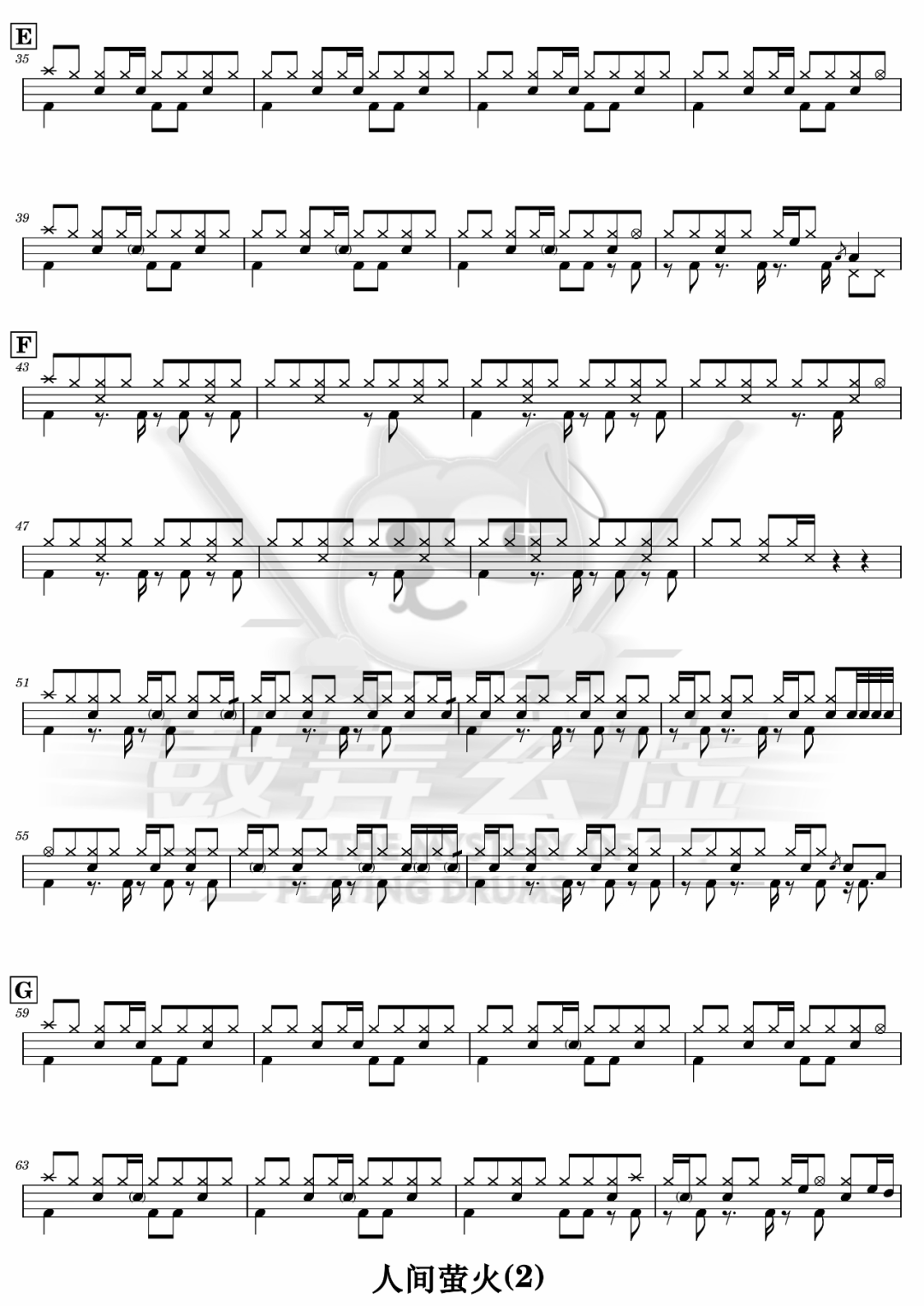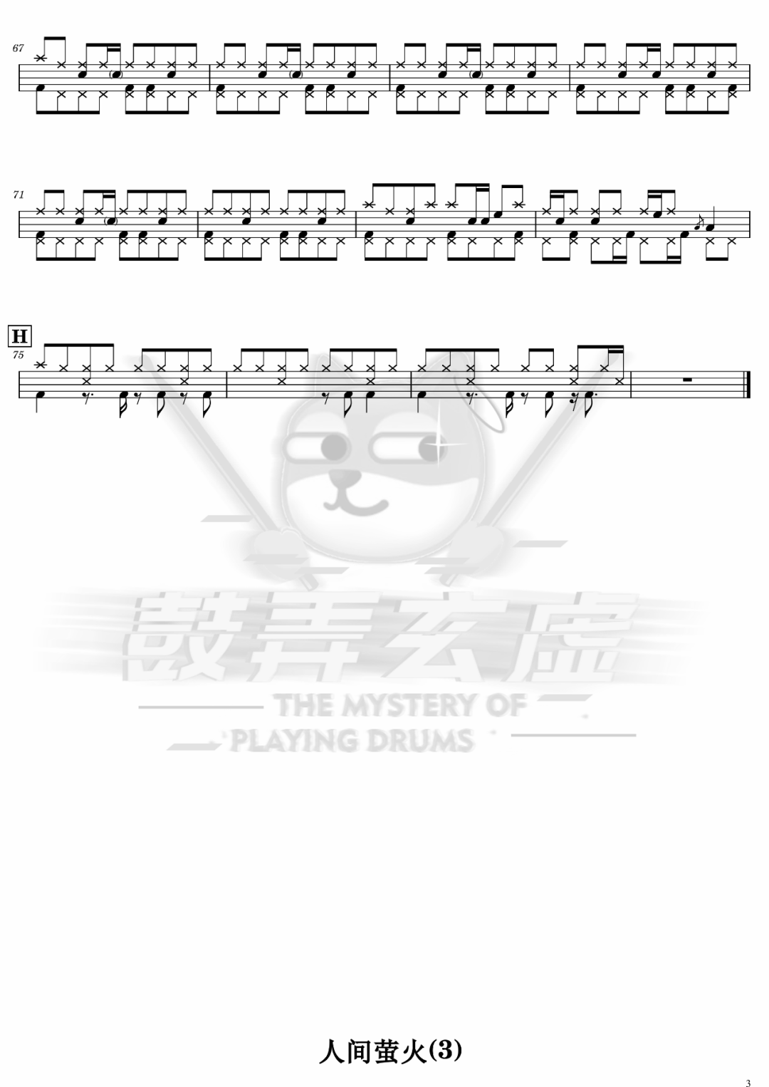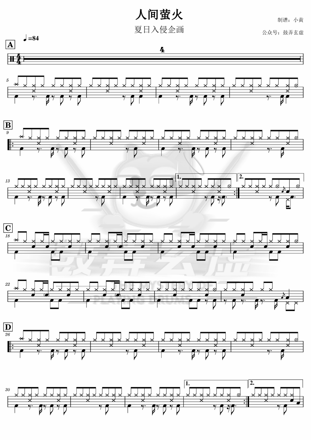 夏日入侵企画《人间萤火》架子鼓谱,鼓弄玄虚编配出品,共有3张高清图谱,由打鼓谱上传并分享。鼓谱:《人间萤火》-夏日入侵企画
