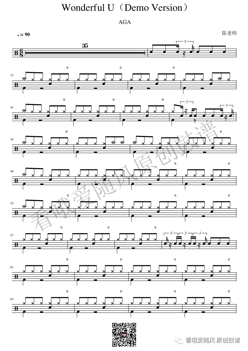 AGA《Wonderful U》架子鼓谱, 看哦爱随风编配出品,共有3张高清图谱,由打鼓谱上传并分享。NO.144 Wonderful U(Demo Version)AGA鼓谱