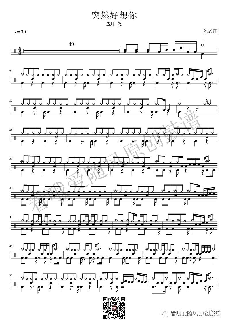 五月天《突然好想你》架子鼓谱, 看哦爱随风编配出品,共有2张高清图谱,由打鼓谱上传并分享。NO.140 突然好想你 五月天 鼓谱