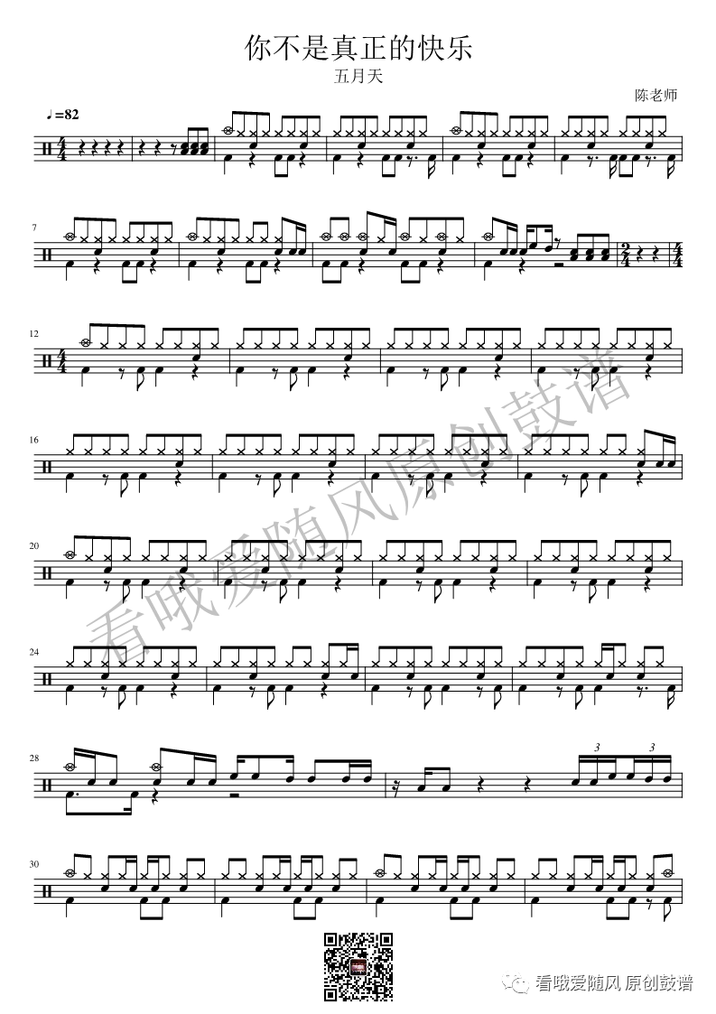 五月天《你不是真正的快乐》架子鼓谱, 看哦爱随风编配出品,共有3张高清图谱,由打鼓谱上传并分享。NO.157 你不是真正的快乐 五月天 鼓谱