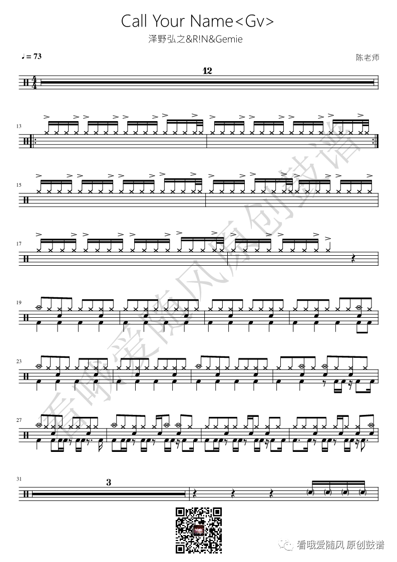 泽野弘之《Call Your Name》鼓谱 - 架子鼓谱 看哦爱随风 • 2022-11-03 • 阅读 1197 泽野弘之《Call Your Name》架子鼓谱, 看哦爱随风编配出品,共有3张高清图谱,由打鼓谱上传并分享。NO.232 Call Your Name(Gv)【进击的巨人】鼓谱 泽野弘之《Call Your Name》鼓谱 - 架子鼓谱 - 第1张 泽野弘之《Call Your Name》鼓谱 - 架子鼓谱 - 第2张 泽野弘之《Call Your Name》鼓谱 - 架子鼓谱 - 第3张 免责声明:本文版权归属 看哦爱随风,本站不对其内容的准确性给予任何承诺,收录仅供读者参考。如本文侵犯了您的合法权益,请及时联系本站,我们将在24小时内删除处理。本文链接:https://www.dagupu.com/pu/544.html 五月天《后来的我们》鼓谱 - 架子鼓谱 上一篇 2022-11-03 进击的巨人/泽野弘之《Call Your Name》鼓谱 - 架子鼓谱 下一篇 2022-11-03 相关推荐 ONE OK ROCK《Re:make》鼓谱 - 架子鼓谱 ONEOKROCK《Re:make》架子鼓谱,看哦爱随风编配出品,共有3张高清图谱,由打鼓谱上传并分享。 看哦爱随风 2023-06-17 5465 ONE OK ROCK《完全感觉Dreamer》鼓谱 - 架子鼓谱 ONEOKROCK《完全感觉Dreamer》架子鼓谱,看哦爱随风编配出品,共有4张高清图谱,由打鼓谱上传并分享。 看哦爱随风 2023-06-17 4043 ONE OK ROCK《The Beginning》鼓谱 - 架子鼓谱 ONEOKROCK《TheBeginning》架子鼓谱,看哦爱随风编配出品,共有3张高清图谱,由打鼓谱上传并分享。 看哦爱随风 2023-06-17 3607 ONE OK ROCK《未完成交響曲》鼓谱 - 架子鼓谱 ONEOKROCK《未完成交響曲》架子鼓谱,看哦爱随风编配出品,共有1张高清图谱,由打鼓谱上传并分享。 看哦爱随风 2023-06-17 3253 网球王子《future》鼓谱 - 架子鼓谱 网球王子《future》架子鼓谱,看哦爱随风编配出品,共有1张高清图谱,由打鼓谱上传并分享。 看哦爱随风 2023-06-17 3785 夏日入侵企画《人间萤火》鼓谱 - 架子鼓谱 夏日入侵企画《人间萤火》架子鼓谱,看哦爱随风编配出品,共有2张高清图谱,由打鼓谱上传并分享。 看哦爱随风 2023-02-26 3598 夏日入侵企画《勇气》鼓谱 - 架子鼓谱 夏日入侵企画《勇气》架子鼓谱,看哦爱随风编配出品,共有2张高清图谱,由打鼓谱上传并分享。 看哦爱随风 2023-02-26 3600 周杰伦《一路向北》鼓谱 - 架子鼓谱 周杰伦《一路向北》架子鼓谱,看哦爱随风编配出品,共有1张高清图谱,由打鼓谱上传并分享。 看哦爱随风 2023-02-26 5473 萧敬腾《倒带》鼓谱 - 架子鼓谱 萧敬腾《倒带》架子鼓谱,看哦爱随风编配出品,共有2张高清图谱,由打鼓谱上传并分享。 看哦爱随风 2023-02-26 3944 容祖儿《东京人寿》鼓谱 - 架子鼓谱 容祖儿《东京人寿》架子鼓谱,看哦爱随风编配出品,共有2张高清图谱,由打鼓谱上传并分享。 看哦爱随风 2023-02-26 3519 悶餅MOONBAND《Dear Mary》鼓谱 - 架子鼓谱 悶餅MOONBAND《DearMary》架子鼓谱,看哦爱随风编配出品,共有2张高清图谱,由打鼓谱上传并分享。 看哦爱随风 2023-02-19 2930 MY FIRST STORY《Missing You》鼓谱 - 架子鼓谱 MYFIRSTSTORY《MissingYou》架子鼓谱,看哦爱随风编配出品,共有1张高清图谱,由打鼓谱上传并分享。 看哦爱随风 2023-02-19 3298 ONE OK ROCK《I Was King》鼓谱 - 架子鼓谱 ONEOKROCK《IWasKing》架子鼓谱,看哦爱随风编配出品,共有2张高清图谱,由打鼓谱上传并分享。 看哦爱随风 2023-02-19 3143 ONE OK ROCK《I Was King》鼓谱 - 架子鼓谱 ONEOKROCK《IWasKing》架子鼓谱,看哦爱随风编配出品,共有2张高清图谱,由打鼓谱上传并分享。 看哦爱随风 2023-02-19 3204 ONE OK ROCK《エトセトラ》鼓谱 - 架子鼓谱 ONEOKROCK《エトセトラ》架子鼓谱,看哦爱随风编配出品,共有2张高清图谱,由打鼓谱上传并分享。 看哦爱随风 2023-02-19 3266 如龙 维新 OP《Clock Strikes》鼓谱 - 架子鼓谱 如龙维新OP《ClockStrikes》架子鼓谱,看哦爱随风编配出品,共有1张高清图谱,由打鼓谱上传并分享。 看哦爱随风 2023-02-19 3204