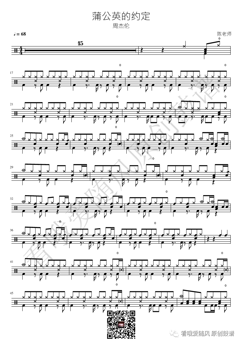 周杰伦《蒲公英的约定》架子鼓谱, 看哦爱随风编配出品,共有2张高清图谱,由打鼓谱上传并分享。NO.252 蒲公英的约定 周杰伦 鼓谱