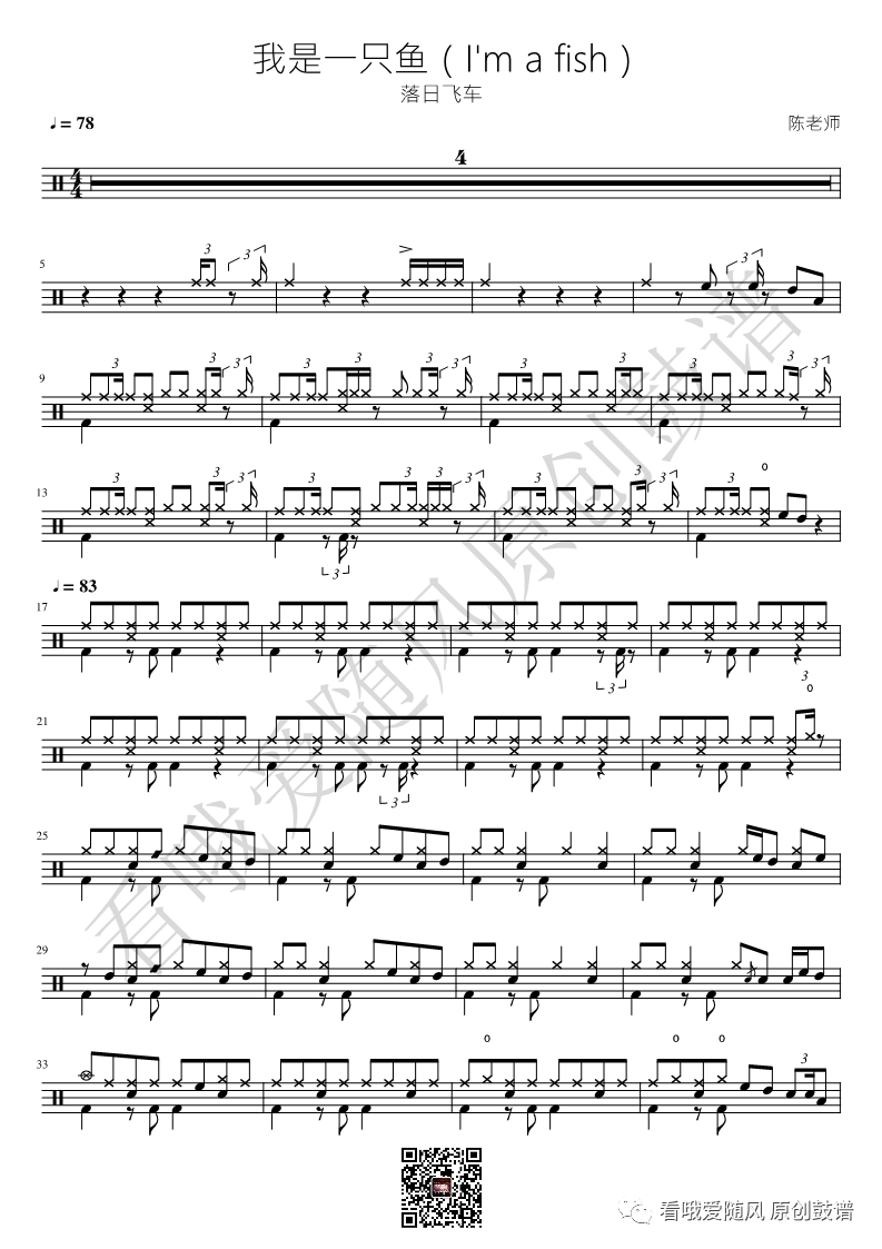 落日飞车《我是一只鱼》架子鼓谱, 看哦爱随风编配出品,共有3张高清图谱,由打鼓谱上传并分享。NO.282 我是一只鱼(I‘m a fish)落日飞车 鼓谱