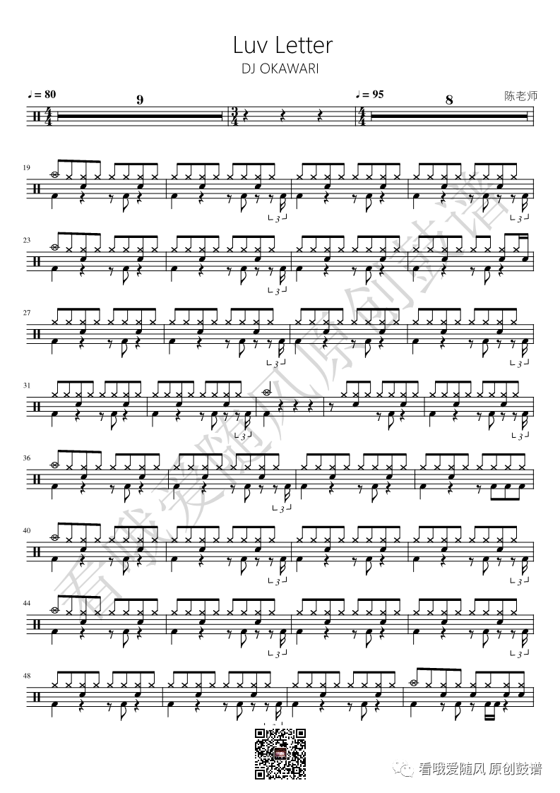 DJ OKAWARI《Luv Letter》架子鼓谱, 看哦爱随风编配出品,共有2张高清图谱,由打鼓谱上传并分享。NO.288 Luv Letter 情书【DJ OKAWARI】鼓谱
