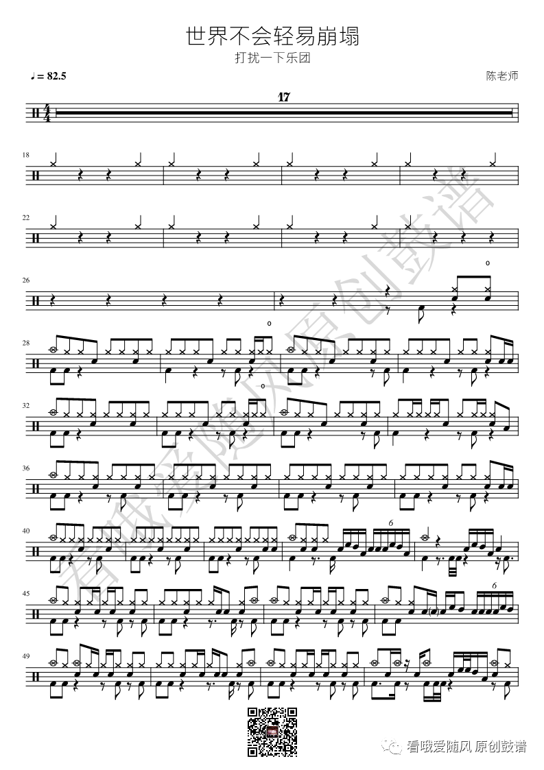 打扰一下乐团《世界不会轻易崩塌》架子鼓谱, 看哦爱随风编配出品,共有2张高清图谱,由打鼓谱上传并分享。NO.298 世界不会轻易崩塌 打扰一下乐团 鼓谱