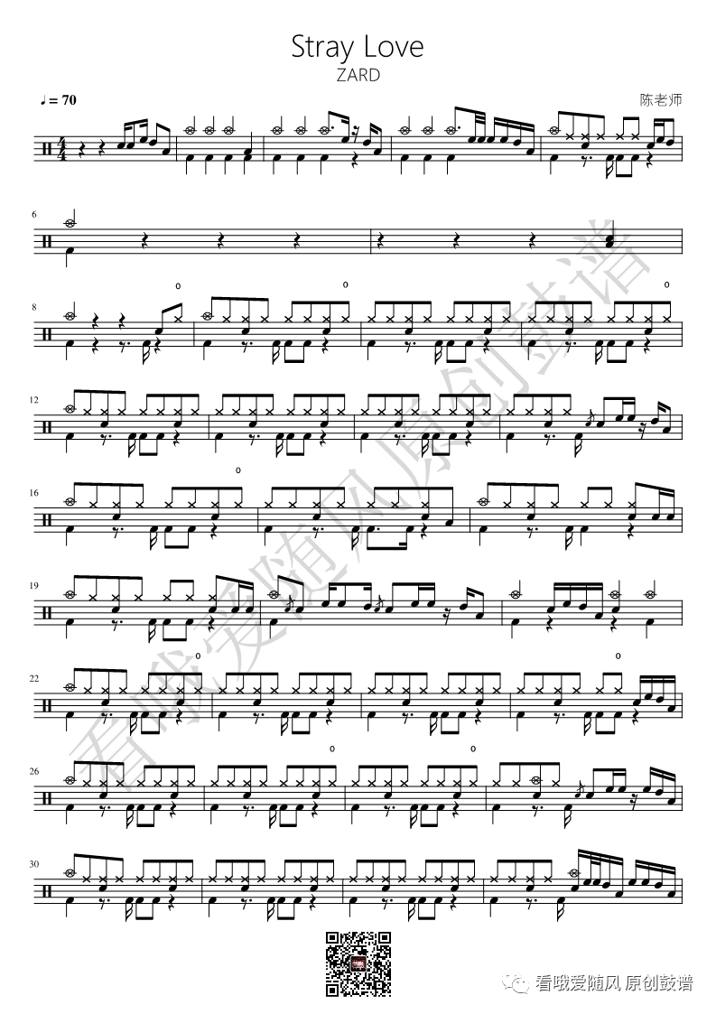 ZARD《Stray Love》架子鼓谱, 看哦爱随风编配出品,共有2张高清图谱,由打鼓谱上传并分享。NO.301 Stray Love【ZARD】鼓谱