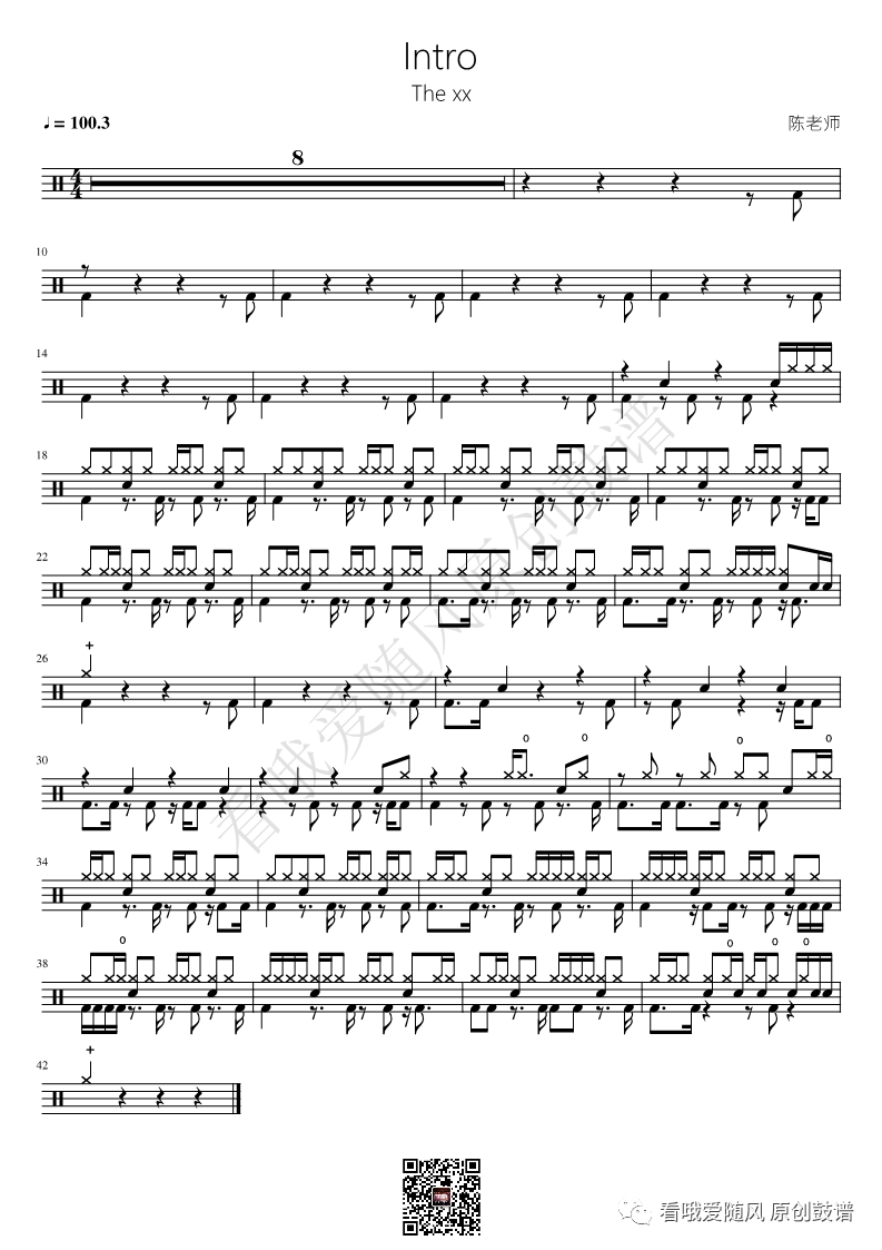 The xx《Intro》架子鼓谱, 看哦爱随风编配出品,共有1张高清图谱,由打鼓谱上传并分享。NO.324 Intro The xx 鼓谱