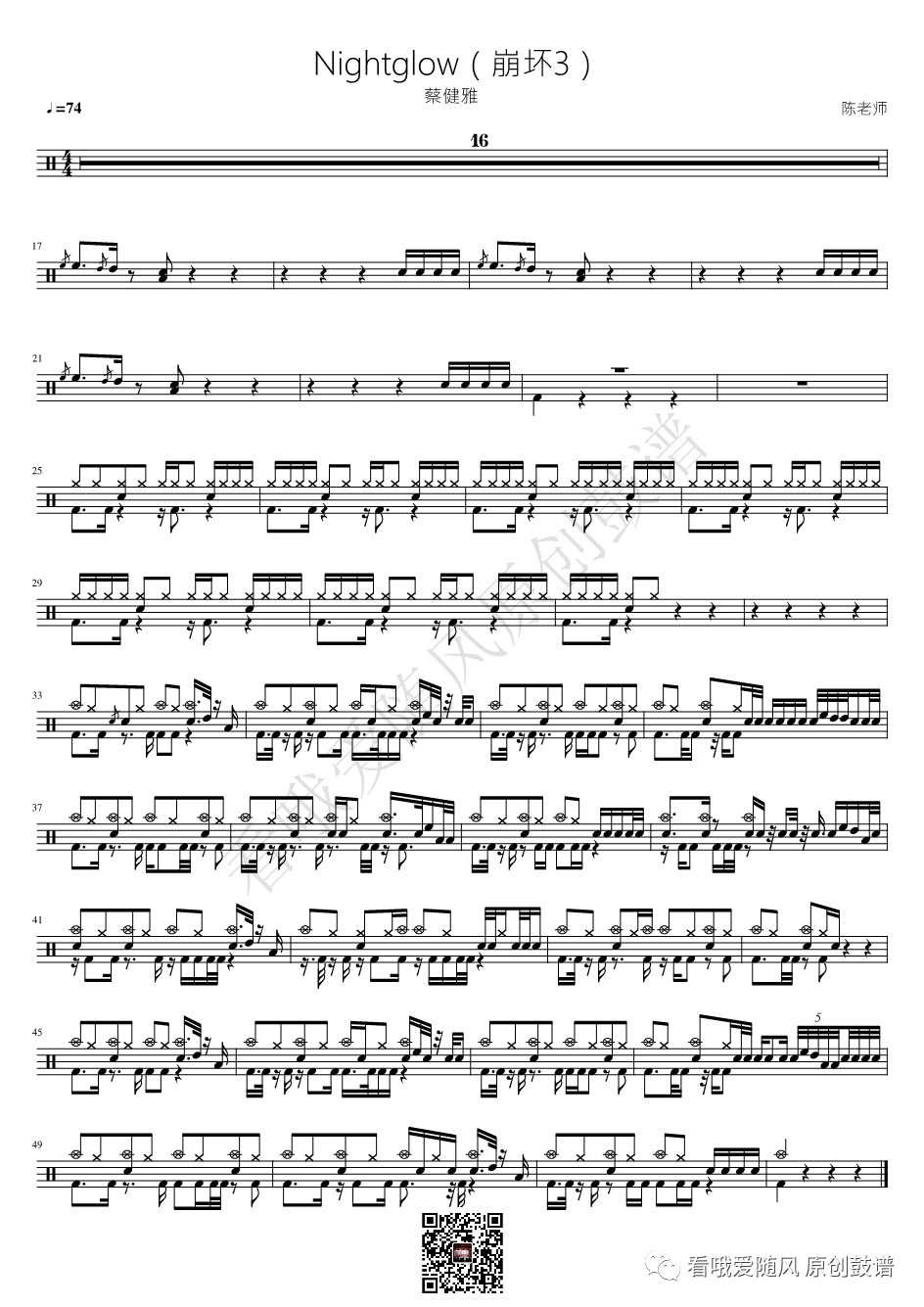 蔡健雅《Nightglow【崩坏3】》架子鼓谱, 看哦爱随风编配出品,共有1张高清图谱,由打鼓谱上传并分享。NO.335 Nightglow【崩坏3】蔡健雅