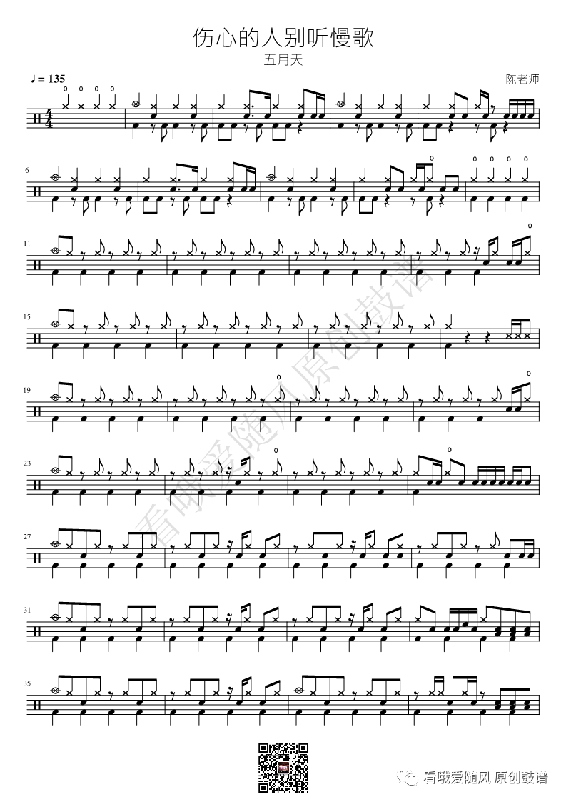 五月天《伤心的人别听慢歌》架子鼓谱, 看哦爱随风编配出品,共有3张高清图谱,由打鼓谱上传并分享。NO.373 伤心的人别听慢歌 五月天 鼓谱
