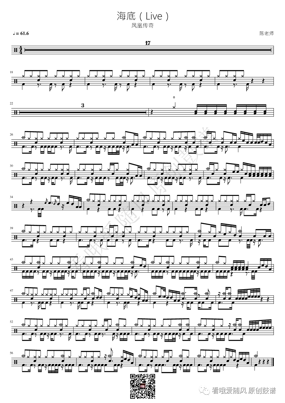 凤凰传奇《海底》架子鼓谱(Live), 看哦爱随风编配出品,共有1张高清图谱,由打鼓谱上传并分享。NO.372 海底(Live)凤凰传奇 鼓谱