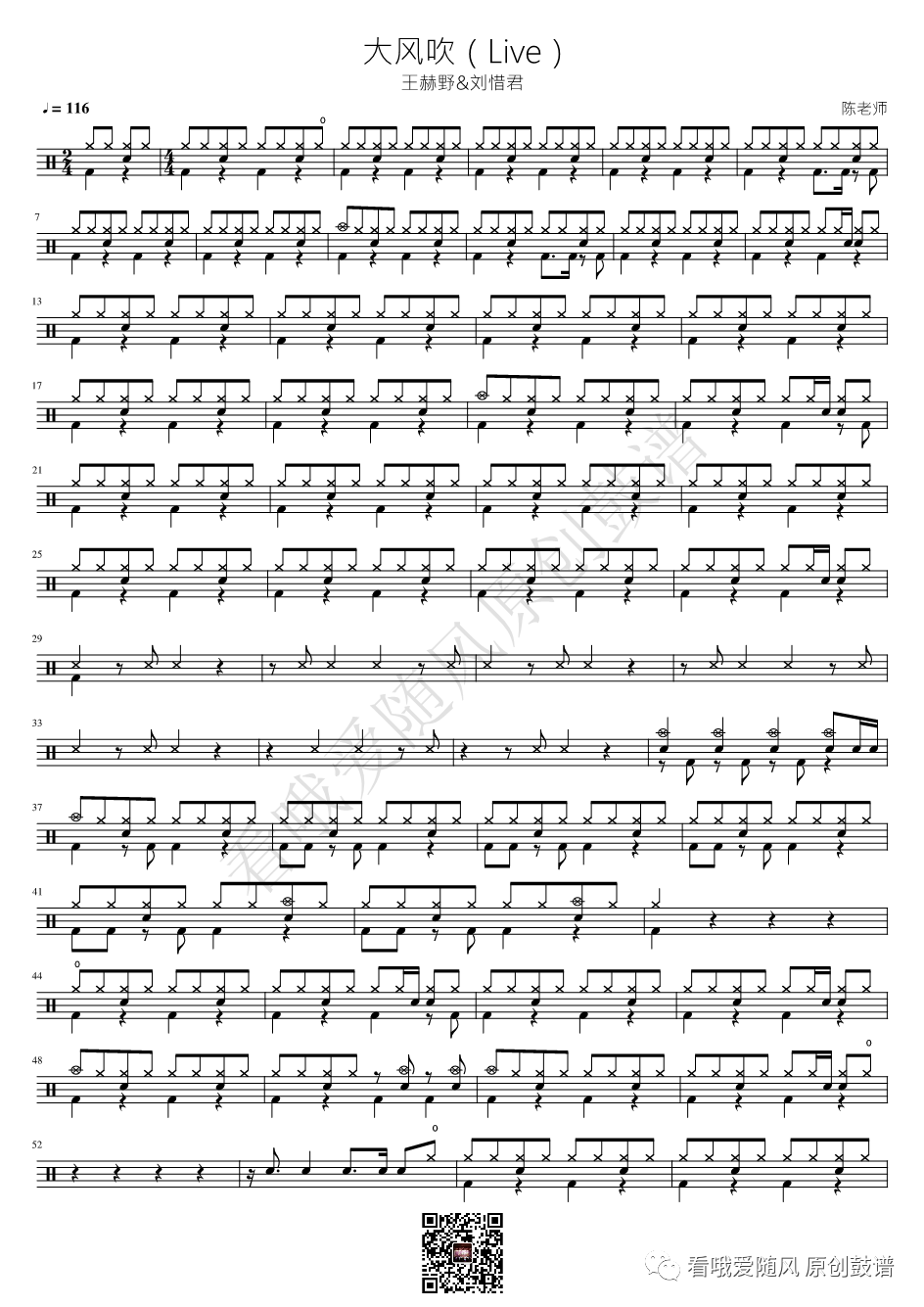 王赫野《大风吹》架子鼓谱, 看哦爱随风编配出品,共有2张高清图谱,由打鼓谱上传并分享。NO.381 大风吹(Live)王赫野&刘惜君 鼓谱