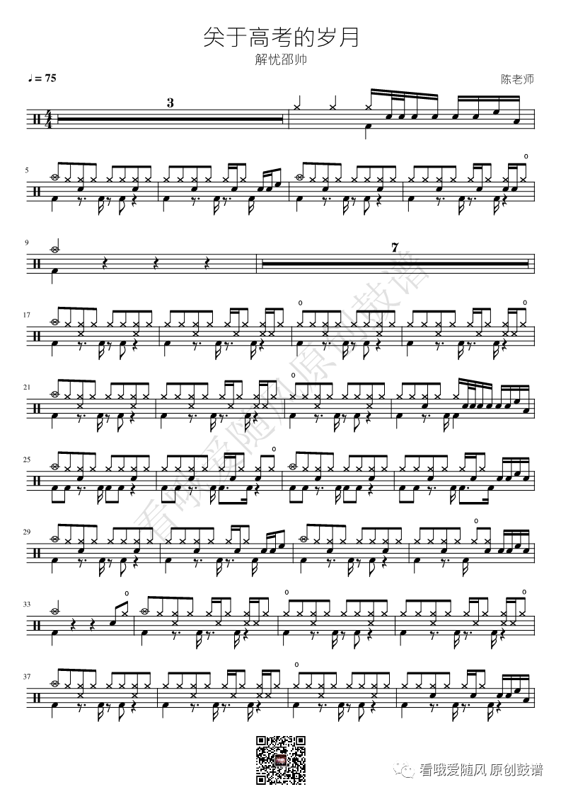 解忧邵帅《关于高考的岁月》架子鼓谱, 看哦爱随风编配出品,共有2张高清图谱,由打鼓谱上传并分享。NO.399 关于高考的岁月 解忧邵帅 鼓谱